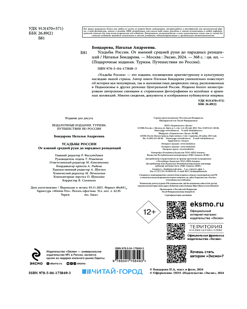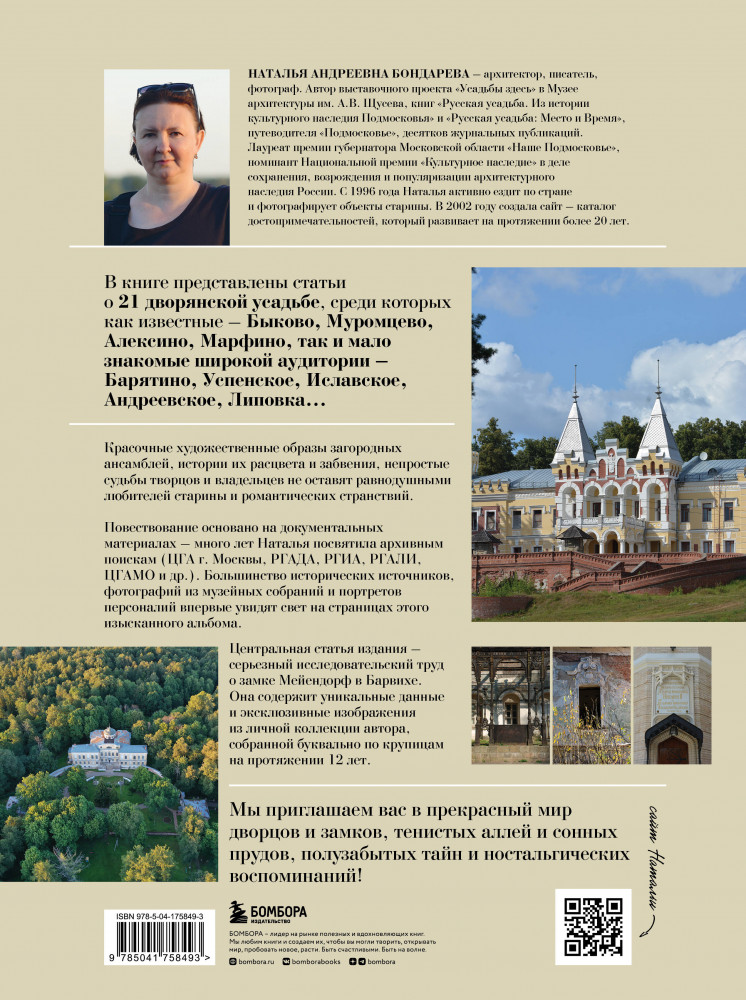 Серия: Подарочные издания. Туризм. Путешествия по России Наталья Бондарева — архитектор, фотограф и писатель. Лауреат премии Губернатора Московской области «Наше Подмосковье», а также номинант Национальной премии «Культурное наследие» за заслуги в деле сохранения, возрождения и популяризации архитектурного наследия России. Наталья путешествует с 1996 года. За это время ей удалось объездить не только все Подмосковье, но и соседние с ним области, и накопить бесценный материал о памятниках старины центральной России. Наталья ведет свой собственный блог и сайт, где делится уникальной информацией — nataturka.ru. Увидев, в каком плачевном состоянии находятся многие архитектурные и исторические памятники, как безвозвратно гибнет наше культурное наследие, Наталья решила рассказывать об этом тем, кому это не безразлично.