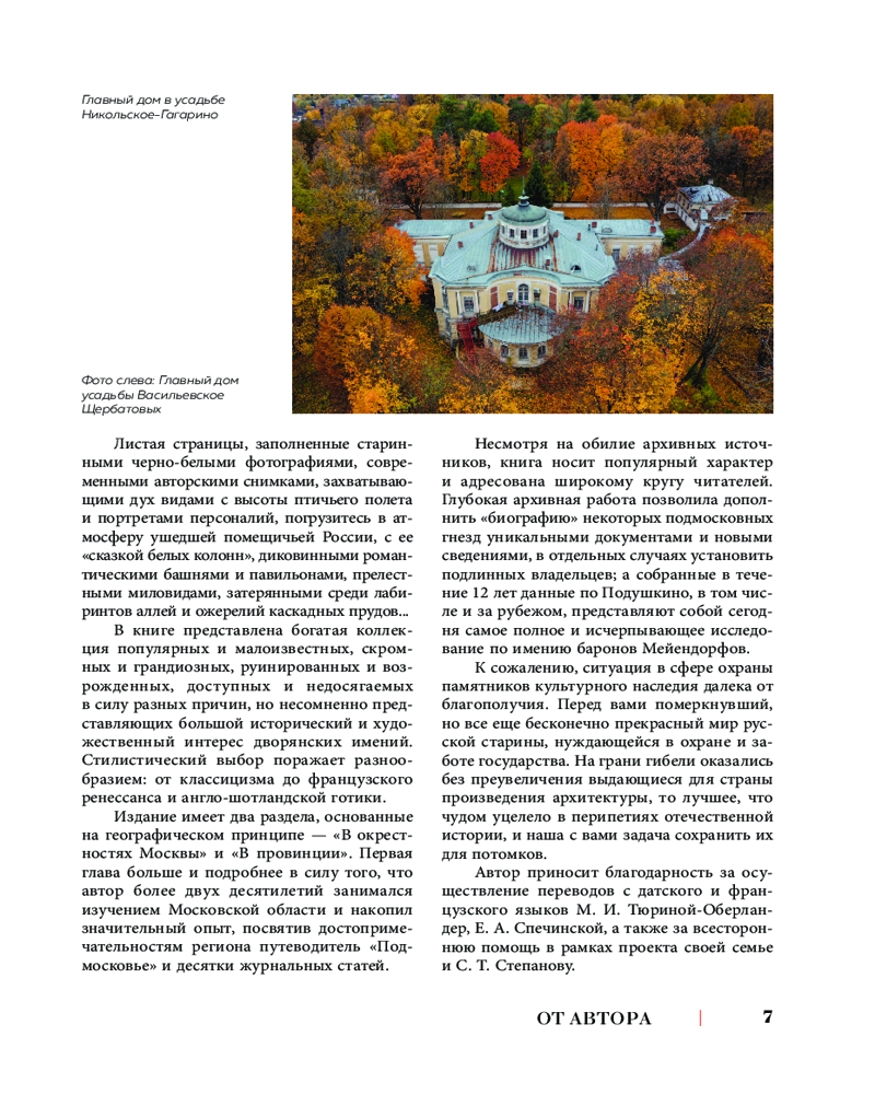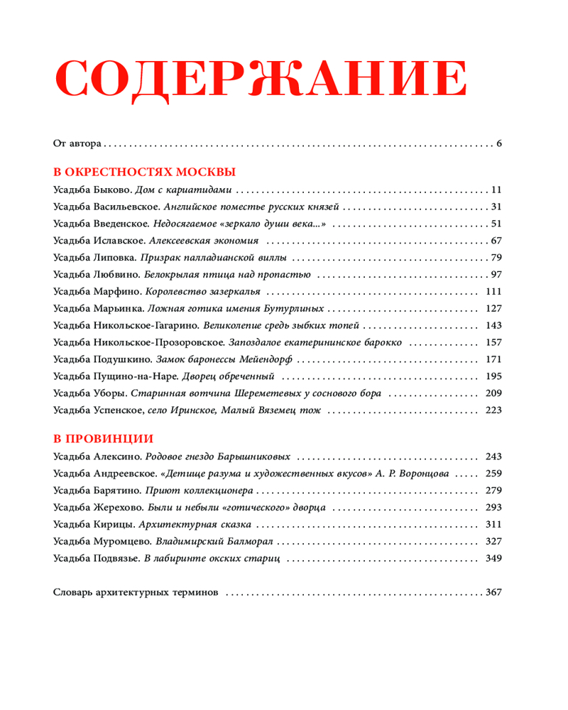 Книга дает увлекательный обзор разнообразных стилей — от барокко до классицизма, от модерна до неоклассики. Роскошные парки, озера, павильоны и аллеи оживают перед глазами читателей благодаря ярким описаниям и архивным материалам. Вы найдете статьи о 21 дворянской усадьбе, среди которых как известные — Быково, Муромцево, Алексино, Марфино, так и мало знакомые широкой аудитории — Барятино, Успенское, Иславское, Андреевское, Липовка и т.д. В данном издании также впервые опубликована подробная информация про замок Майендорф (усадьба Подушкино).