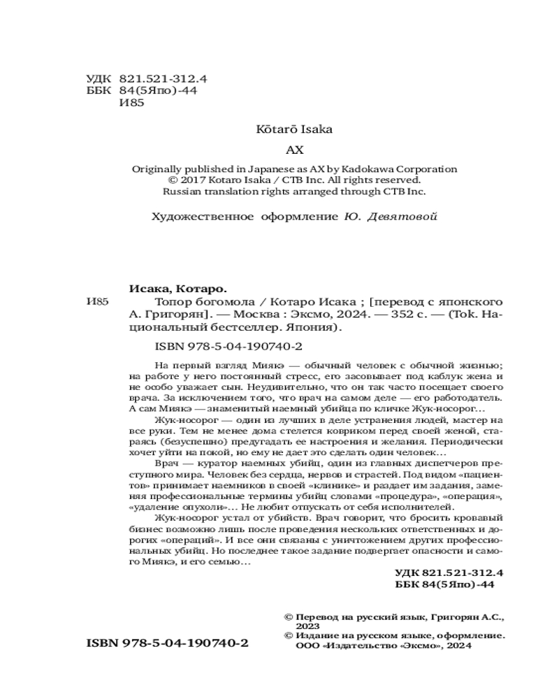 💳 Оплатить за товар можно при получении 🇰🇿 Есть бесплатная доставка по Казахстану от 1 дня 🎁 Копите бонусы с каждой покупки Серия: Tok. Национальный бестселлер. Япония На первый взгляд, Миякэ — обычный человек с обычной жизнью; на работе у него постоянный стресс, его засовывает под каблук жена и не особо уважает сын. Неудивительно, что он так часто посещает своего врача. За исключением того, что врач на самом деле — его работодатель. А сам Миякэ — знаменитый наемный убийца по кличке Жук-носорог... |
