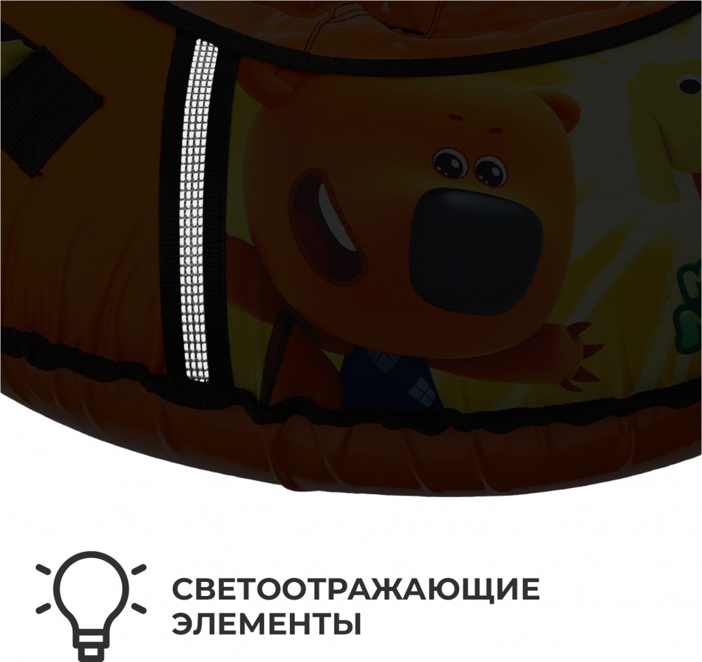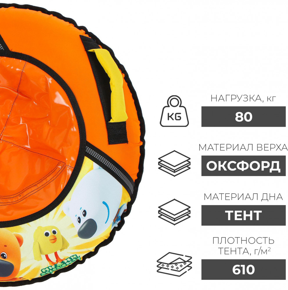 Дно тюбинга изготовлено из автотента ПВХ 610, что гарантирует долгий срок службы и обеспечивает отличное скольжение. Тюбинг оснащён безопасными эргономичными ручками и молнией для быстрого доступа к камере. Он имеет закрытую сердцевину, что исключает попадание снега внутрь. Фактический размер накачанного тюбинга зависит от температуры внешней среды и давления в камере. Для тюбинга подойдёт камера 13 дюймов.