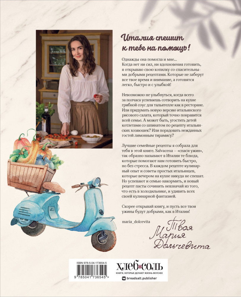 💳 Оплатить за товар можно при получении 🇰🇿 Есть бесплатная доставка по Казахстану от 1 дня 🎁 Копите бонусы с каждой покупки Серия: Мировая гастрономия «Когда нет ни сил, ни вдохновения готовить, я открываю свою копилку со спасительными добрыми рецептами. Которые не заберут все твое время и внимание, а готовятся легко, быстро и с улыбкой! Невозможно не улыбнуться, когда всего за полчаса успеваешь сотворить на кухне грибной соус для тальятелле как в ресторане. Или придумать новую версию итальянского рисового салата, который точно понравится всей семье. А может быть, угостить детей котлетами со шпинатом по рецепту итальянских хозяюшек? Или порадовать нежданных гостей лимонным тирамису? Лучшие семейные рецепты я собрала для тебя в этой книге. Salvacena — «спаси ужин», так образно называют в Италии те блюда, которые помогают нам готовить быстро, но без стресса. В каждом рецепте кулинарный опыт и советы простых итальянцев, которые вечером на кухне никуда не спешат. Но успевают и семью накормить, и новый рецепт пасты сочинить невзначай из того, что есть в холодильнике, и удивить всех своей кулинарной фантазией. Скорее открывай книгу, и пусть все твои ужины будут добрыми, как в Италии!» — Мария Лисицина |