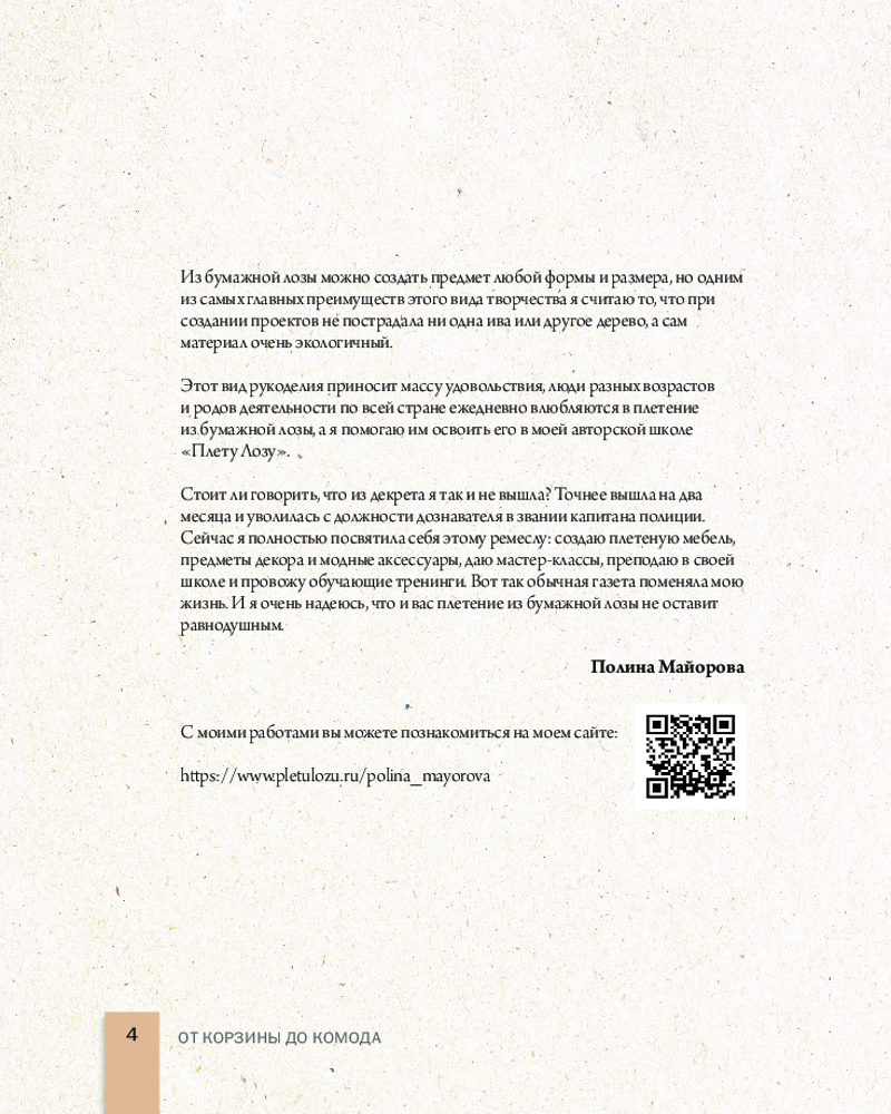 Полина Майорова — дизайнер изделий из бумажной лозы, блогер с аудиторией более 105 000 подписчиков, автор популярных книг по рукоделию и ведущая передач по плетению из бумажной лозы. За 8 лет она обучила свыше 1200 человек, и многие из них успешно монетизировали любимое хобби.