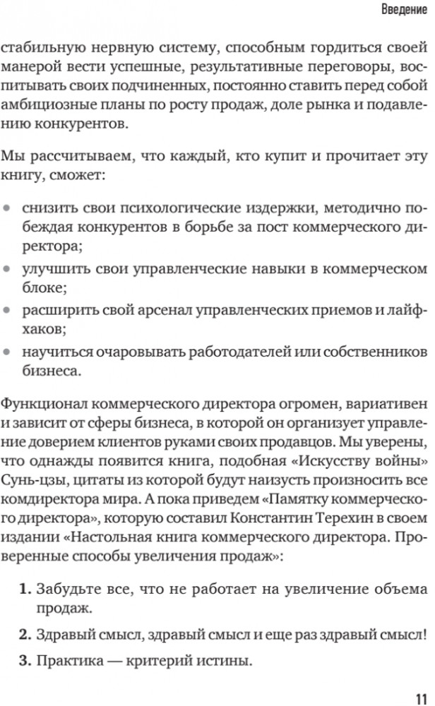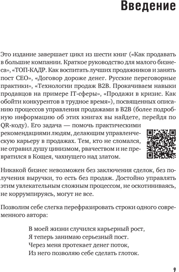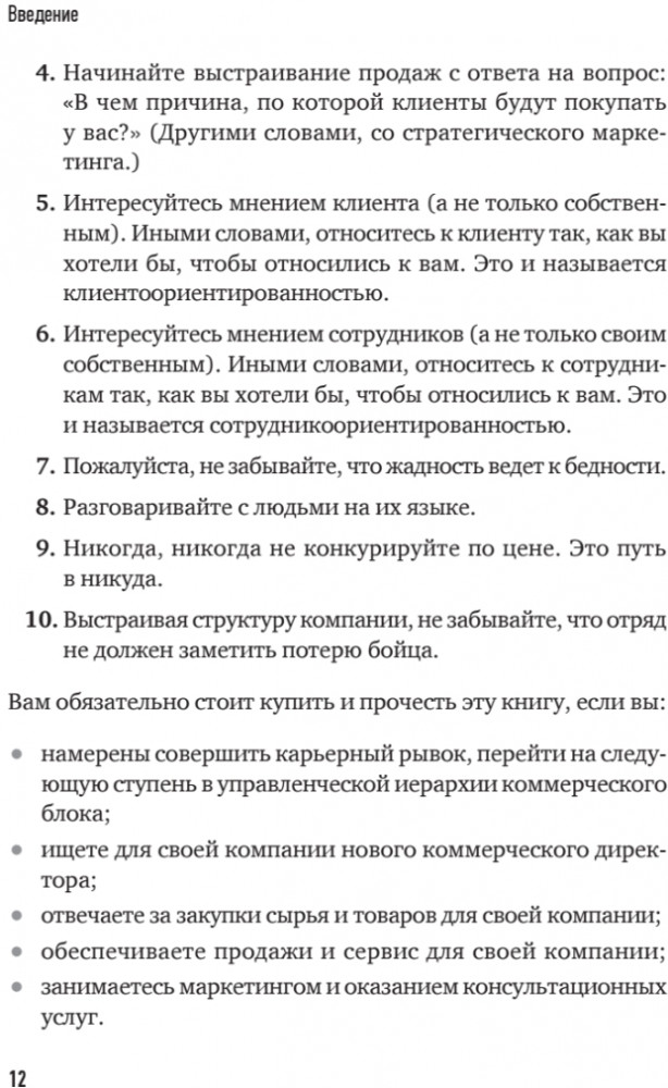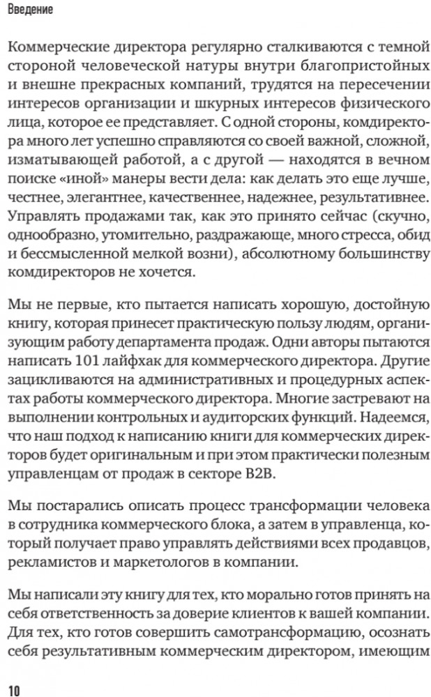 Коммерческий директор 2.0. 25 ключевых компетенций руководителя в продажахАндрей Ващенко, Евгений Колотилов материал инструкция раскрытие темы В данный момент этот товар отсутствует в продаже. Возможно, у нас найдется аналогичный или похожий товар здесь. Серия: Бизнес-психология (твердый переплет) Эта книга о том, как амбициозный человек может своими руками создать фундамент для карьерного скачка в коммерческие директора, если поставит себе задачу разобраться в психологии управления доверием клиентов и деловых партнеров. Вы поймете, как человеческий фактор предопределяет объем полномочий, права и реальные возможности коммерческого директора в конкретной компании. Вы узнаете, как вновь назначенному коммерческому директору можно избежать типовых ошибок, совершенных предшественниками. Также вы увидите, как продуманная работа с персоналом коммерческого блока поможет шаг за шагом завоевать особое доверие собственников и акционеров. Вы сможете выяснить, как коммерческому директору влиять на выручку компании за счет повышения квалификации, корректировки действующей переговорной модели, освоения новых методов управления персоналом в компании. |