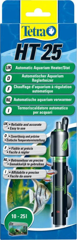 «Tetra HT» — автоматический нагреватель, позволяет регулировать температуру воды в аквариуме в диапазоне от 19°C до 31°C с шагом в 0,5°C. Нагреватель изготовлен из двухмиллиметрового сверхпрочного и теплостойкого стекла Bоrosilikat. Устанавливается на стенку аквариума при помощи надежного держателя с присосками. Двойной керамический нагревательный элемент в приборе обеспечит равномерное распределение тепла. Контрольный световой индикатор сигнализирует о включенном терморегуляторе. Предназначен для пресноводного и морского аквариума.