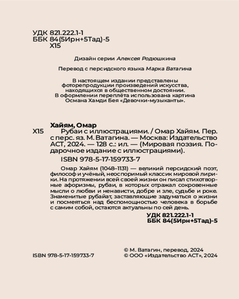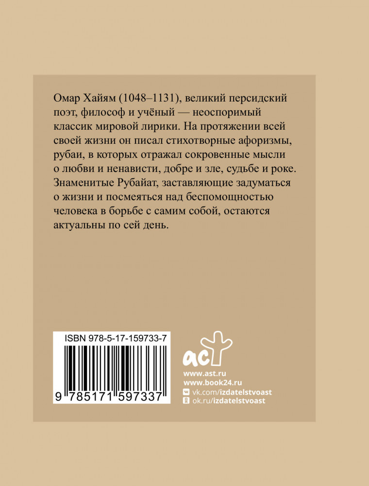 💳 Оплатить за товар можно при получении 🇰🇿 Есть бесплатная доставка по Казахстану от 1 дня 🎁 Копите бонусы с каждой покупки Серия: Мировая поэзия. Подарочное издание с иллюстрациями Омар Хайям (1048-1131) — великий персидский поэт, философ и учёный, неоспоримый классик мировой лирики. На протяжении всей своей жизни он писал стихотворные афоризмы, рубаи, в которых отражал сокровенные мысли о любви и ненависти, добре и зле, судьбе и роке. Знаменитые рубайат, заставляющие задуматься о жизни и посмеяться над беспомощностью человека в борьбе с самим собой, остаются актуальны по сей день. |