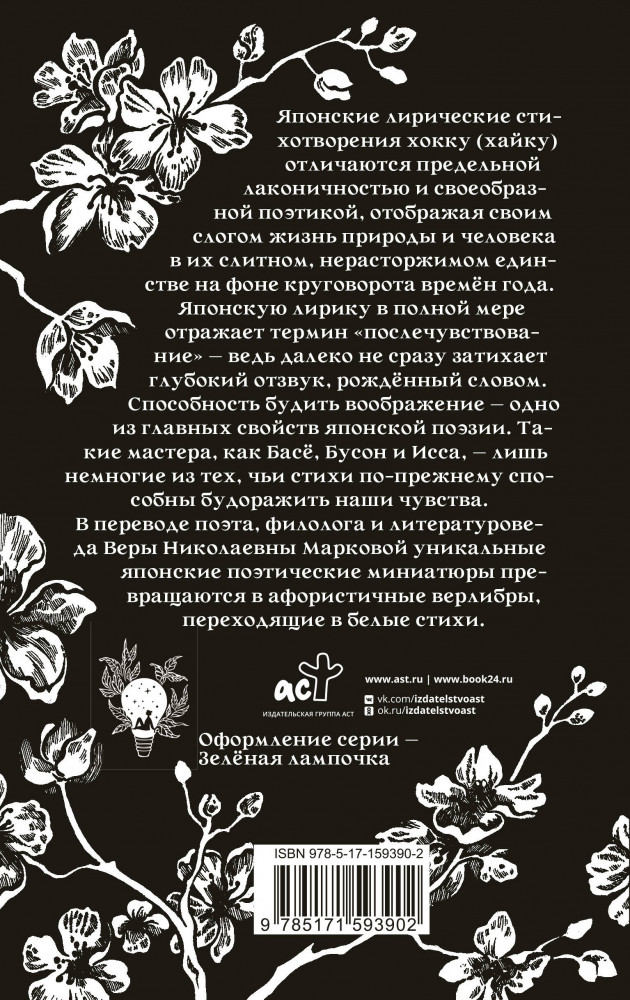 💳 Оплатить за товар можно при получении 🇰🇿 Есть бесплатная доставка по Казахстану от 1 дня 🎁 Копите бонусы с каждой покупки Серия: Поэзия под зелёной лампой Японские лирические стихотворения хокку (хайку) отличаются предельной лаконичностью и своеобразной поэтикой, отображая своим слогом жизнь природы и человека в их слитном, нерасторжимом единстве на фоне круговорота времен года. Японскую лирику в полной мере отражает термин «послечувствование» — ведь далеко не сразу затихает глубокий отзвук, рожденный словом. Способность будить воображение — одно из главных свойств японской поэзии. Такие мастера, как Басё, Бусон и Исса, — лишь немногие из тех, чьи стихи по-прежнему способны будоражить наши чувства. |