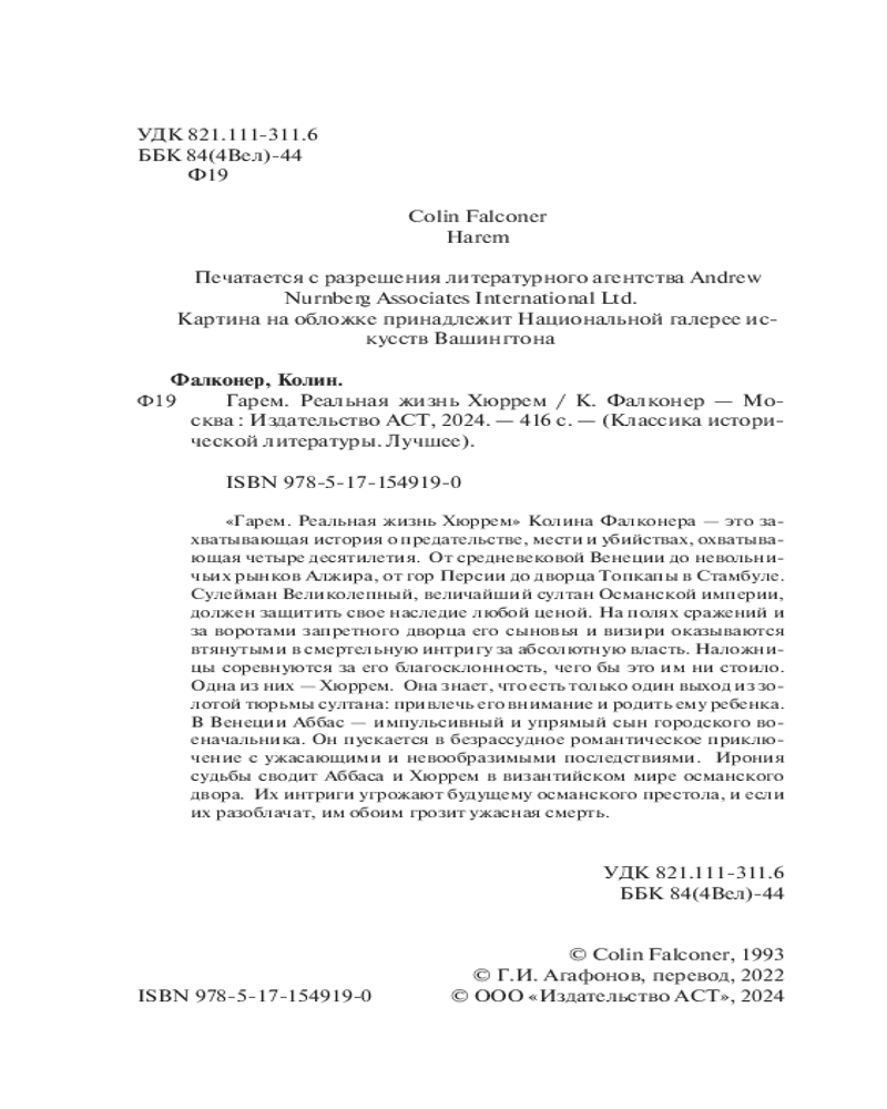 💳 Оплатить за товар можно при получении 🇰🇿 Есть бесплатная доставка по Казахстану от 1 дня 🎁 Копите бонусы с каждой покупки Серия: Классика исторической литературы. Лучшее «Гарем. Реальная жизнь Хюррем» Колина Фалконера — это захватывающая история о предательстве, мести и убийствах, охватывающая четыре десятилетия. От средневековой Венеции до невольничьих рынков Алжира, от гор Персии до дворца Топкапы в Стамбуле. Сулейман Великолепный, величайший султан Османской империи, должен защитить свое наследие любой ценой. На полях сражений и за воротами запретного дворца его сыновья и визири оказываются втянутыми в смертельную интригу за абсолютную власть. |