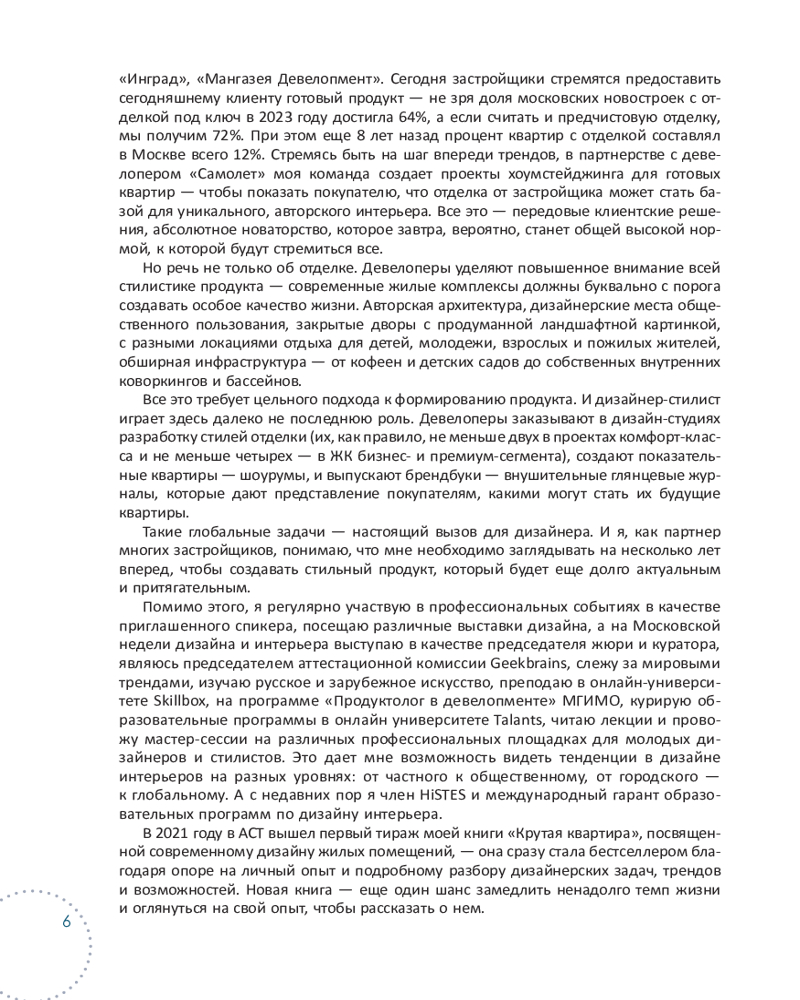 | Создатель и владелец топовой студии «Уютная квартира», искусствовед, колорист и просветитель в дизайне жилых интерьеров. 18 лет в бизнесе, более 1500 реализованных объектов общим объемом свыше 80 000 квадратных метров (эквивалент 3,5 Красных Площадей или 11 футбольных полей FIFA). Спикер университета Skillbox и профессиональных выставок Archdialog, Woman Who Matters, InDecor, Mosbuild, ColorMix, Heimtextil Russia. Шеф-дизайнер застройщиков «КРОСТ» и INGRAD. Автор более 150 экспертных статей и... |