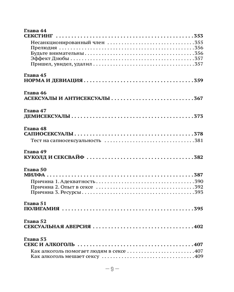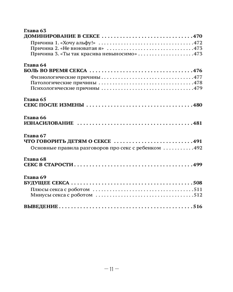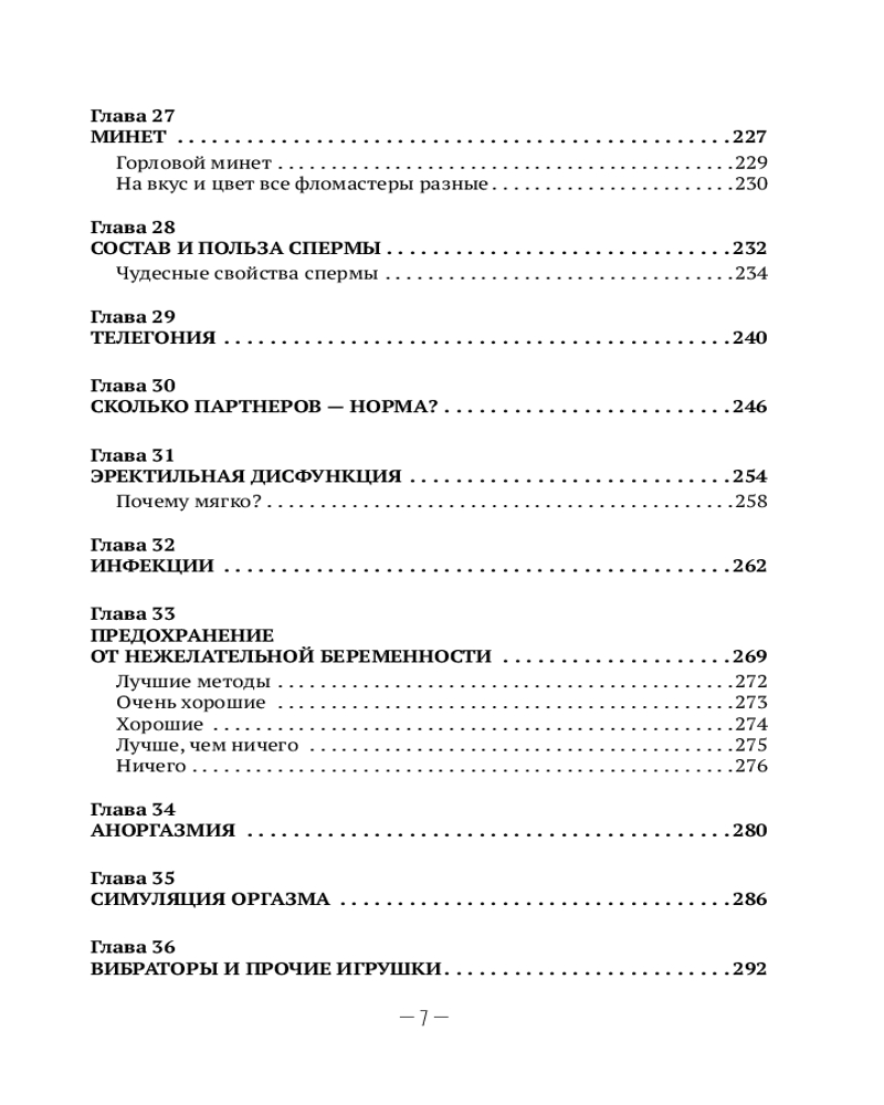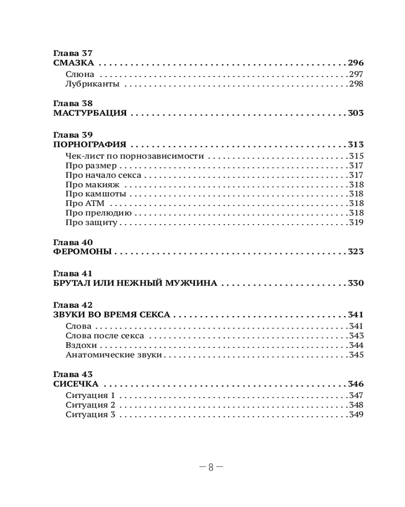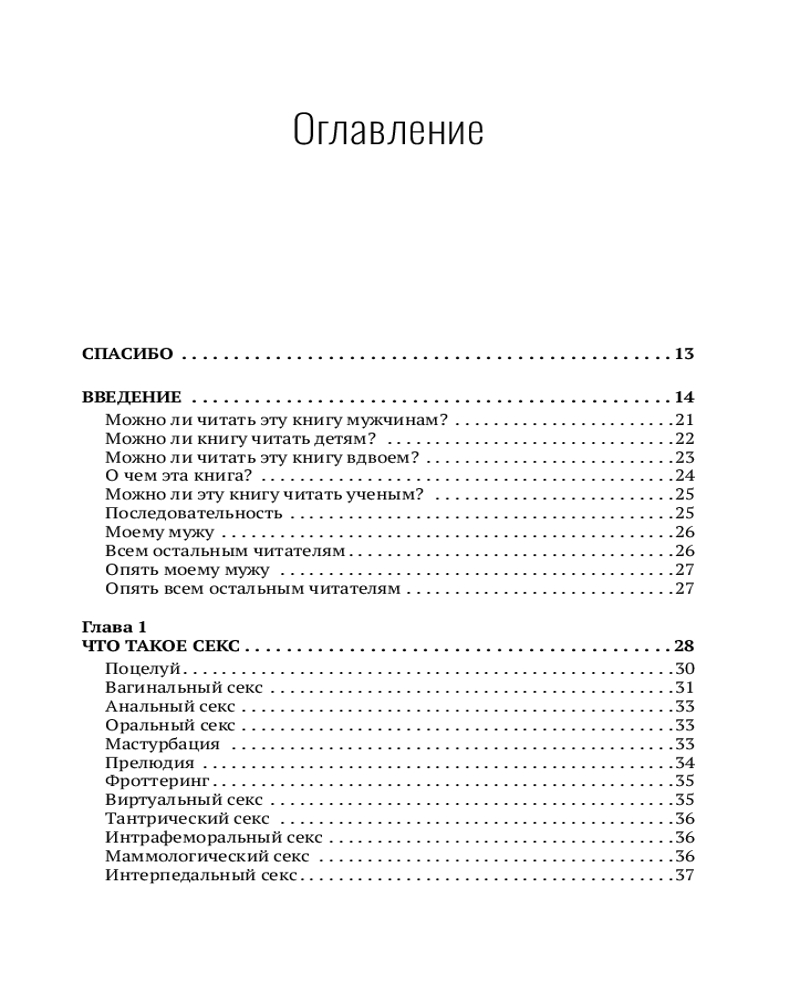 Благодаря этой книге вы узнаете, что 15 сантиметров — это не мало, а даже больше среднестатистической вместимости женщины. Также узнаете, что три минуты фрикций — это в три раза больше нормы, установленной Международной ассоциацией сексуальной медицины (МАСМ). Есть глава про секс втроем. Про секс вдвоем тоже есть. И даже про секс в одного есть глава. Узнаете, что будет, если убрать секс из своей жизни (спойлер: ничего страшного). Определите свою половую конституцию и узнаете про своего партнера много интересного.