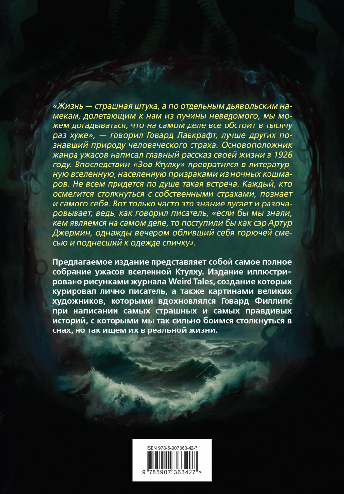 💳 Оплатить за товар можно при получении 🇰🇿 Есть бесплатная доставка по Казахстану от 1 дня 🎁 Копите бонусы с каждой покупки Серия: Подарочные издания. Иллюстрированная классика «Жизнь — страшная штука, а по отдельным дьявольским намекам, долетающим к нам из пучины неведомого, мы можем догадываться, что на самом деле все обстоит в тысячу раз хуже», — говорил Говард Лавкрафт, лучше других познавший природу человеческого страха. Основоположник жанра ужасов написал главный рассказ своей жизни в 1926 году. Впоследствии «Зов Ктулху» превратился в литературную вселенную, населенную призраками из ночных кошмаров. Не всем придется по душе такая встреча. Каждый, кто осмелится столкнуться с собственными страхами, познает и самого себя. Вот только часто это знание пугает и разочаровывает, ведь, как говорил писатель, «если бы мы знали, кем являемся на самом деле, то поступили бы как сэр Артур Джермин, однажды вечером обливший себя горючей смесью и поднесший к одежде спичку». |