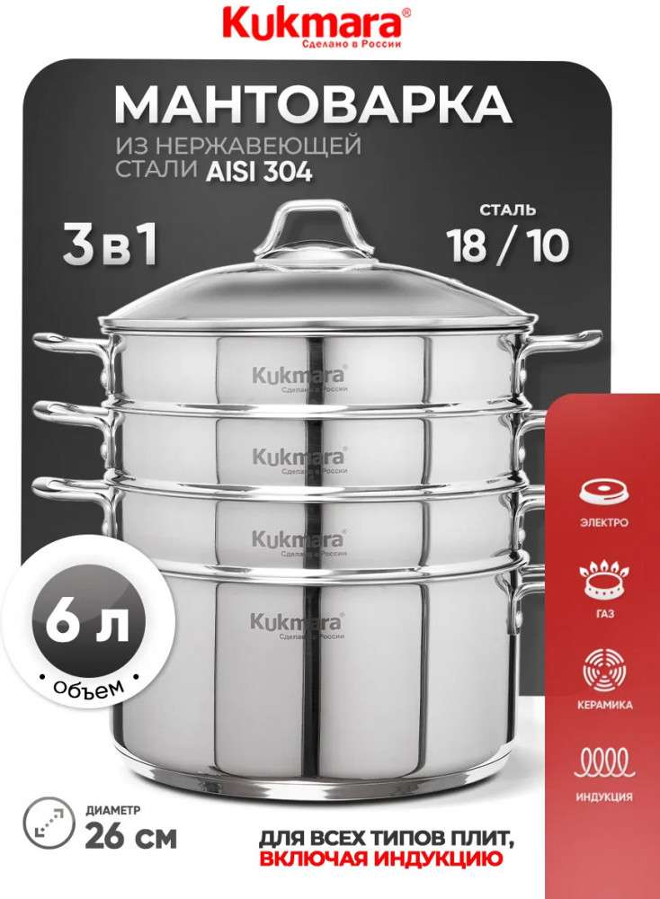 💳 Оплатить за товар можно при получении 🇰🇿 Есть бесплатная доставка по Казахстану от 1 дня 🎁 Копите бонусы с каждой покупки Мантоварка 3 в 1 с расширенными функциями и стильным внешним видом, каждая деталь которой рассчитана и продумана, гармонично дополняет серию посуды Kukmara из нержавеющей стали. Зеркальный блеск ярко подчёркивает высокое качество продукции. Мантоварка идеально подходит для приготовления блюд азиатской кухни (манты, ханум, буузы), а также любых блюд на пару — они получаются диетическими и сохраняют больше полезных и вкусовых качеств. |