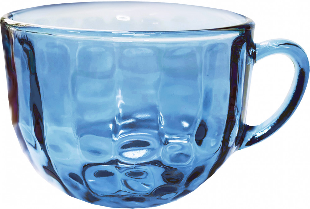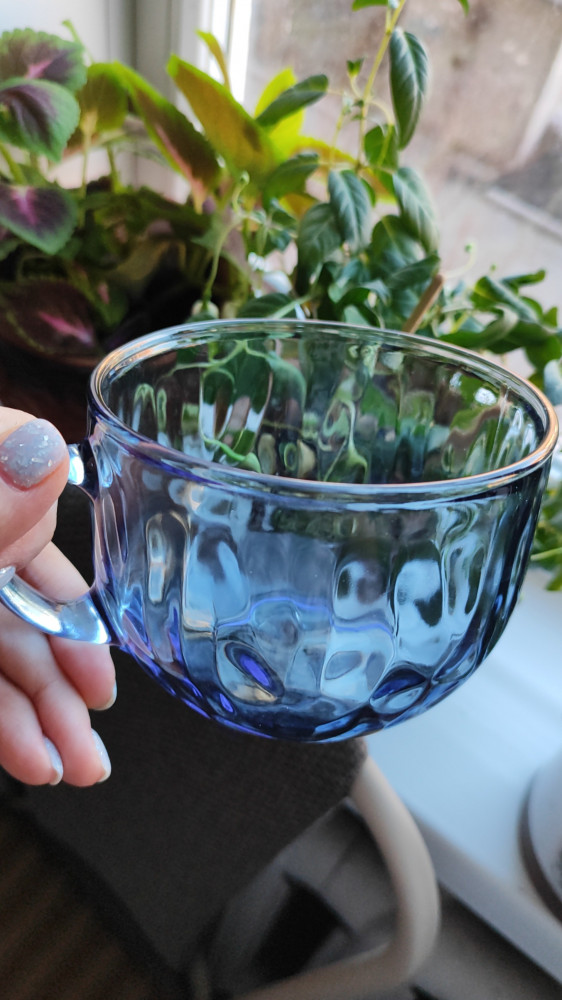 большая, голубая. с неё приятно пить даже просто воду, она смотрится, как прозрачно-голубая