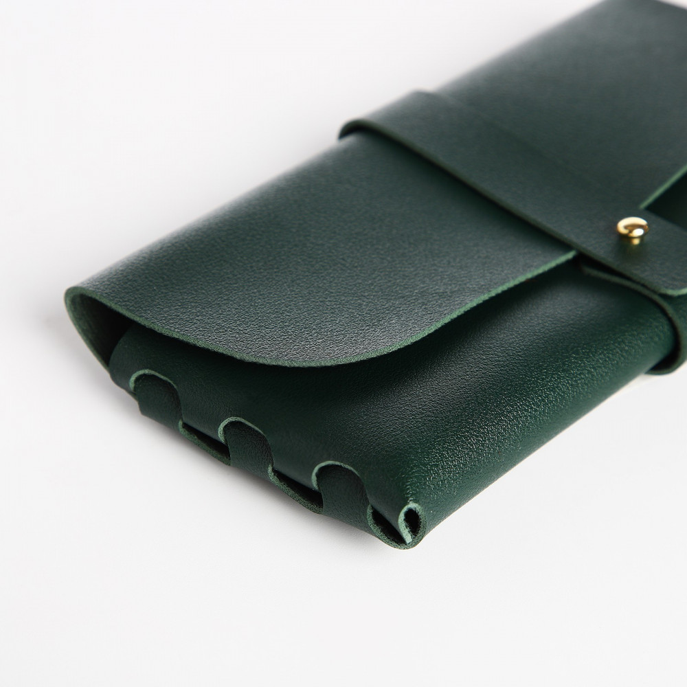 Мягкая кожа, не громоздкий как некоторые футляры, цвет темно синий, очень удобно носить в сумочке и даже в кармане пиджака