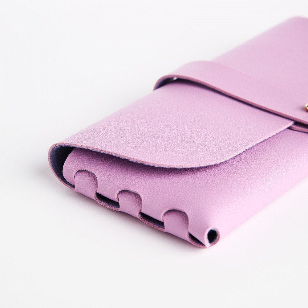 Мягкая кожа, не громоздкий как некоторые футляры, цвет темно синий, очень удобно носить в сумочке и даже в кармане пиджака