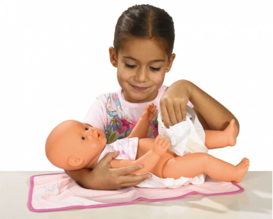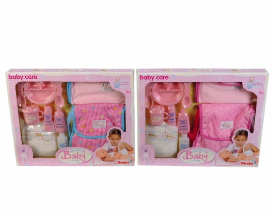 В комплект входит мягкая пеленка, игрушечный крем под подгузник, лосьон для тела, присыпка и подгузник. Так же есть тарелочка и ложечки для кормления, поильник.
