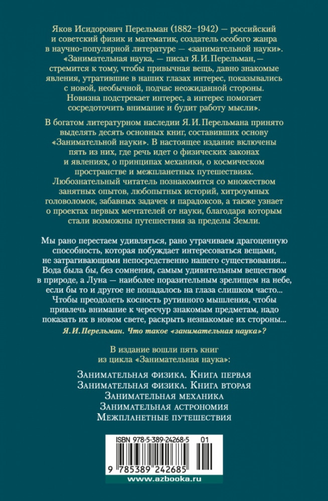 «Занимательная наука, — писал Я. И. Перельман, — стремится к тому, чтобы привычная вещь, давно знакомые явления, утратившие в наших глазах интерес, показывались с новой, необычной, подчас неожиданной стороны. Новизна подстрекает интерес, а интерес помогает сосредоточить внимание и будит работу мысли». В богатом литературном наследии Я. И. Перельмана принято выделять десять основных книг, составивших основу «Занимательной науки». В настоящее издание включены пять из них, где речь идет о физических законах и явлениях, о принципах механики, о космическом пространстве и межпланетных путешествиях. Любознательный читатель познакомится со множеством занятных опытов, любопытных историй, хитроумных головоломок, забавных задачек и парадоксов, а также узнает о проектах первых мечтателей от науки, благодаря которым стали возможны путешествия за пределы Земли. |