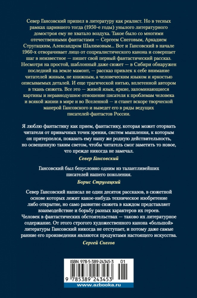 | Север Феликсович Гансовский русский писатель-фантаст. До начала своей творческой деятельности прошел большой жизненный путь: был грузчиком, почтальоном, матросом. Принял участие в Великой Отечественной войне. После возвращения с фронта, закончил филологический факультет Ленинградского государственного университета. Дебют в фантастике состоялся в 1960 г. Известен прежде всего произведениями малой формы: повестями и рассказами. |