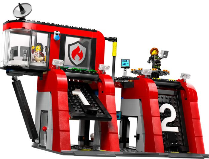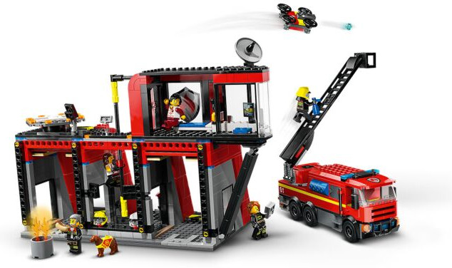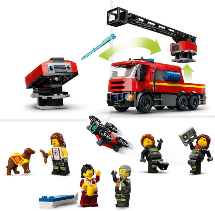• забавные функции для пожарных LEGO®: включает в себя диспетчерскую, мини-кухню, кровать и пожарный столб для минифигурок пожарных, а также грузовик со шлангом, модульной лестницей и приспособлениями для огнетушителя;