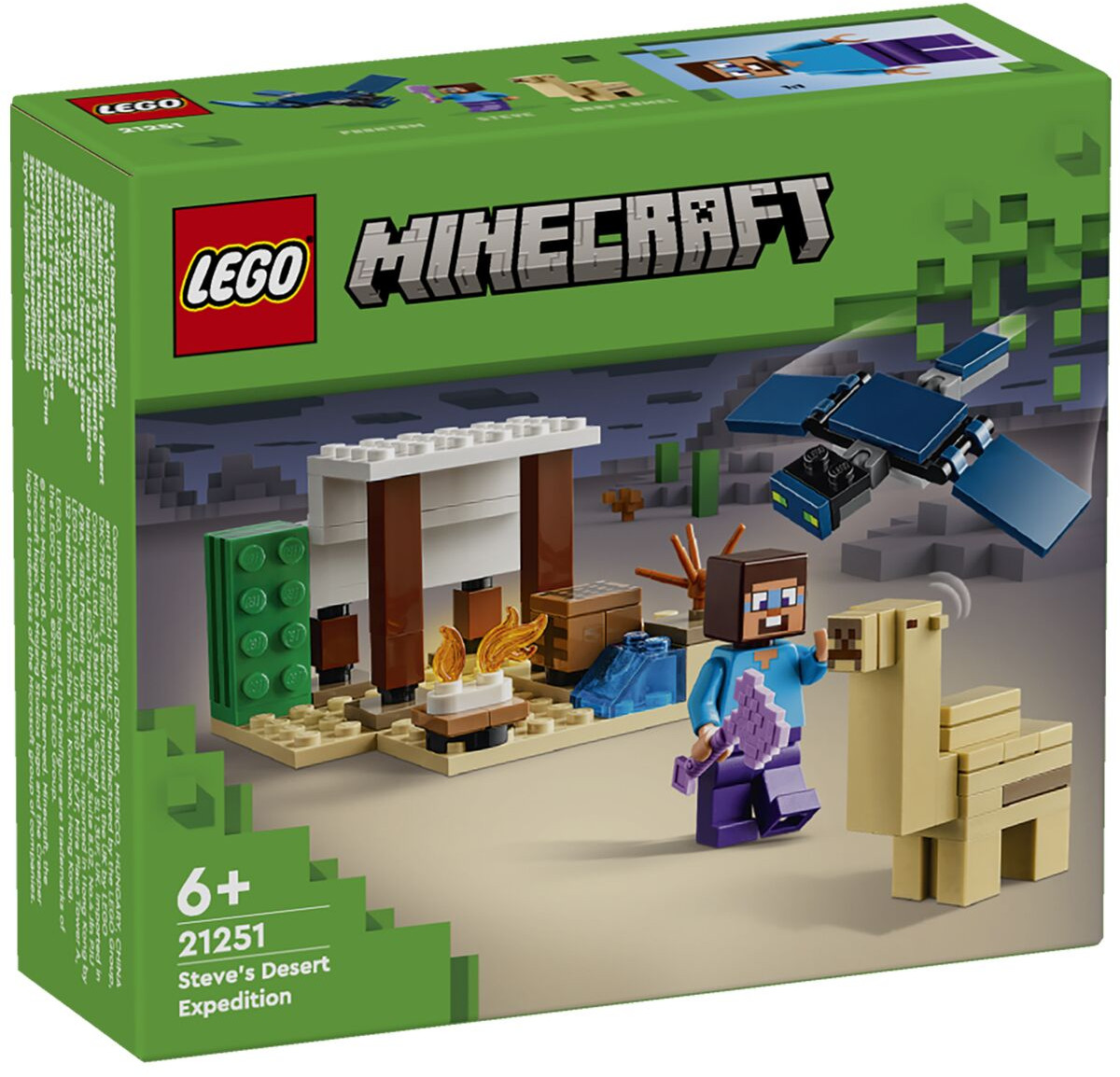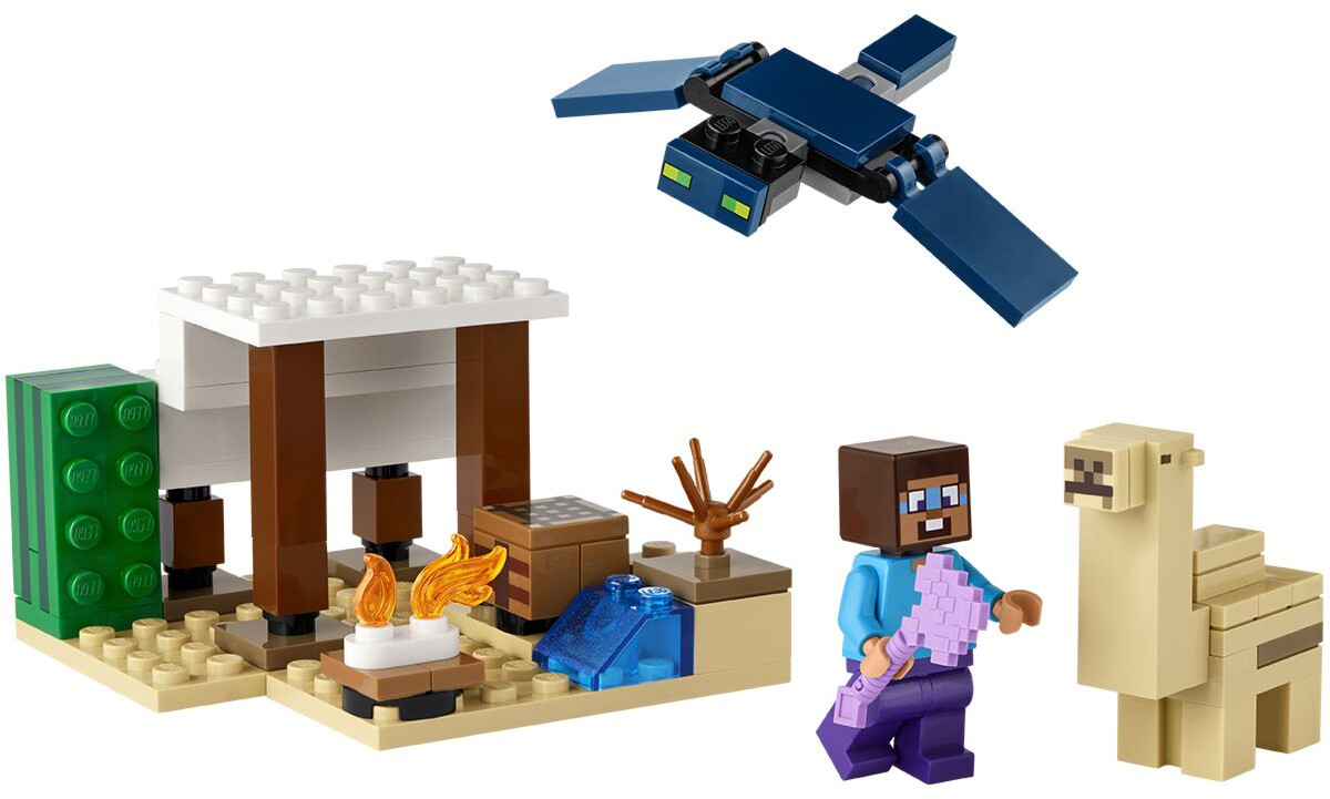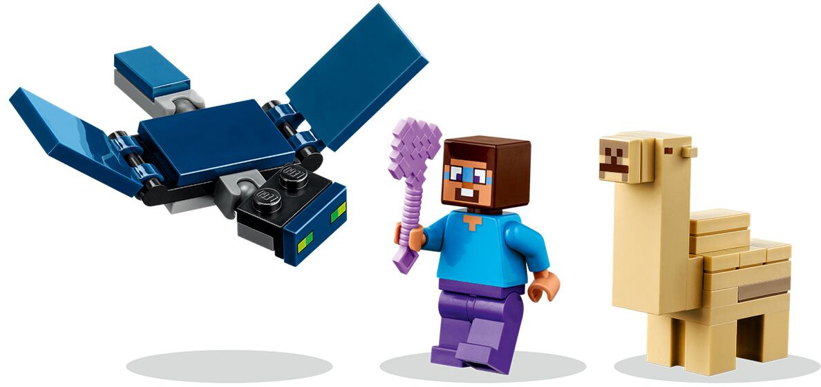 • включает минифигурку популярного персонажа Minecraft Стива, фигурку верблюжонка (впервые!) и летающую фигурку Призрака с подвижными крыльями;