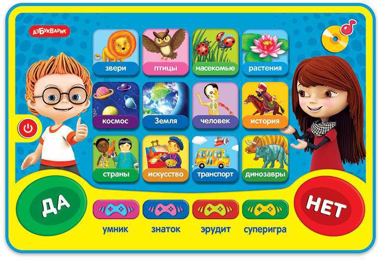 12 тем, 150 вопросов и заданий, мини-плеер и 4 игры («Умник», «Знаток», «Эрудит» и «Суперигра») ждут маленьких эрудитов в этом планшетике. |