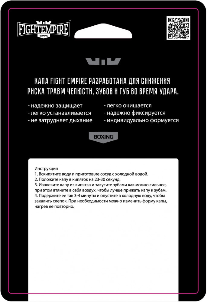 Fight Empire Капа боксёрская одночелюстная «Basic»В данный момент этот товар отсутствует в продаже. Возможно, у нас найдется аналогичный или похожий товар здесь. Капа предназначена для защиты от ударов в челюстно-лицевую область головы. Приспособление отодвигает мягкие ткани полости рта от зубов, предотвращает рваные раны (рассечения), а также ушибы губ и щёк. Одночелюстная капа закрывает только верхнюю челюсть. Изделие выполнено из силикона. Материал нетоксичный, не имеет запаха и вкуса, не способствует росту грибков и развитию бактерий. После использования капу достаточно промыть с мылом и ополоснуть водой. Правильно сваренная капа хорошо держится и не выпадает из открытого рта. |
