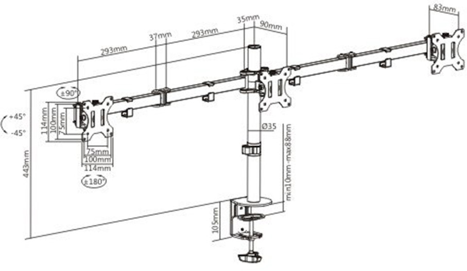Brateck Кронштейн для трех мониторовВ данный момент этот товар отсутствует в продаже. Возможно, у нас найдется аналогичный или похожий товар здесь. Настольный кронштейн для трех мониторов, Brateck, LDT12-C034N, 13"-27″, нагрузка 3 × 7 кг, наклон +/- 45°, поворот +/- 90°, вращение монитора +/- 180°, VESA 75 × 75,100 × 100, ширина зажима: 10 ~ 88 мм, прокладка: 10 ~ 75 мм. |