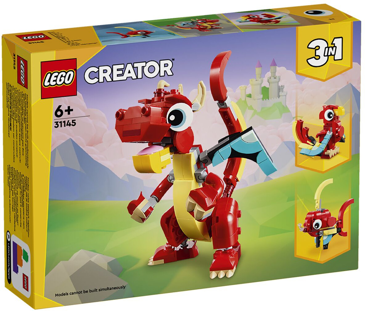 Серия: LEGO Creator Благодаря конструктору «Красный дракон 3 в 1» (31145) творческие дети шести лет и старше перенесутся в волшебную страну, полную чудесных историй. В набор входит очаровательный дракончик с большими глазами и подвижными лапами, руками, крыльями, ногами, ступнями, головой и пастью, чтобы вы могли ставить его на полке в самых разных позах.