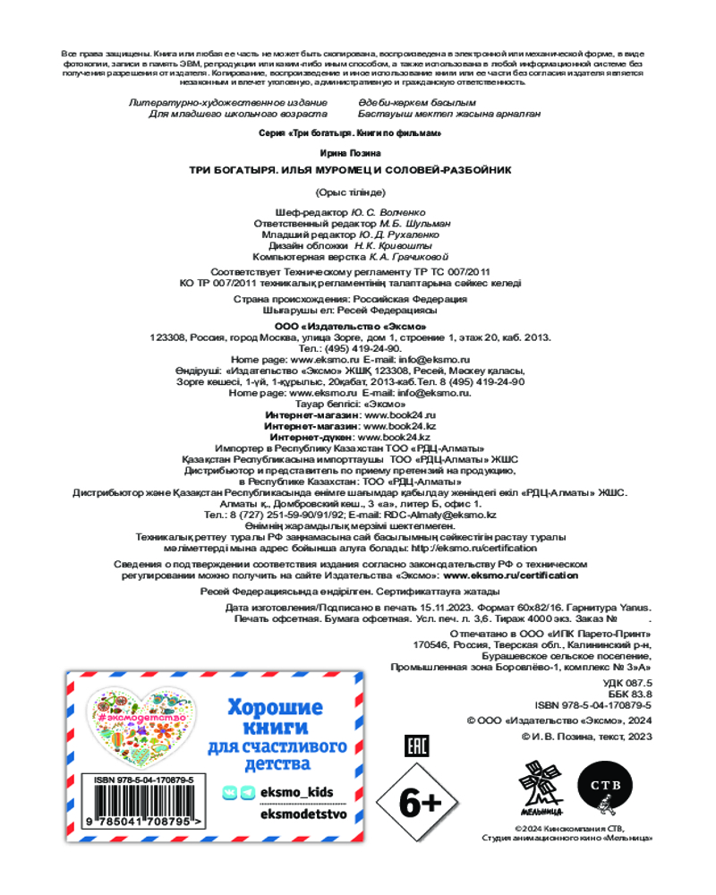 💳 Оплатить за товар можно при получении 🇰🇿 Есть бесплатная доставка по Казахстану от 1 дня 🎁 Копите бонусы с каждой покупки Серия: Три богатыря. Книги по фильмам Эта книга придётся по душе всем любителям популярного мультфильма «Три богатыря. Илья Муромец и Соловей-разбойник», созданного анимационной студией «Мельница». История, так полюбившаяся детям и взрослым благодаря захватывающему сюжету и юмору, вновь оживёт на этих ярких страницах! Вас ждут удивительные приключения Ильи Муромца, которому предстоит вернуть своего коня Бурушку, похищенного Соловьём-Разбойником. Вместе с ним в опасное путешествие отправляются Князь Киевский, который надеется вернуть украденную казну, и летописец Алёнушка. Яркие красивые иллюстрации передают полюбившуюся атмосферу оригинального мультфильма, а лёгкий, динамичный текст делает книгу ещё увлекательней. |