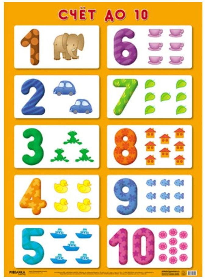 Малыш (1г7м) не может пройти мимо этого плаката, чтобы не ткнуть пальчиком на какую-нибудь цифру. Очень удобный - крупные цифры, яркие и знакомые предметы для счета. Малышу легко обводить пальчиком каждую цифру, плакат не перегружен лишней информацией. Очень довольна!