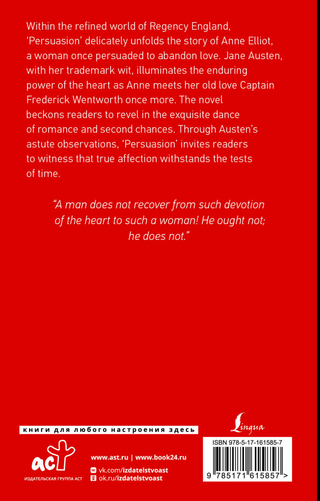 💳 Оплатить за товар можно при получении 🇰🇿 Есть бесплатная доставка по Казахстану от 1 дня 🎁 Копите бонусы с каждой покупки Серия: Exclusive Classics Paperback Предпочитаете учиться у носителей? Тогда у кого же, как не у Джейн Остен? «Persuasion» или «Доводы рассудка» — это последний роман Остен, писательницы, с чьим именем неразрывно связана английская литература. Он рассказывает о судьбе Энн Элиотт, девушки, которая отказалась от помолвки, уступив доводам «мудрых» людей. Через несколько лет она вновь сталкивается с со своим прежним женихом. Прекрасный шанс для неё; но теплится ли ещё любовь в его сердце? Это самый зрелый роман Джейн Остен, достаточно небольшой, чтобы без труда прочесть его. Текст приведен без адаптации и сокращений. Наслаждайтесь изысканной иронией Джейн Остен в оригинале! |