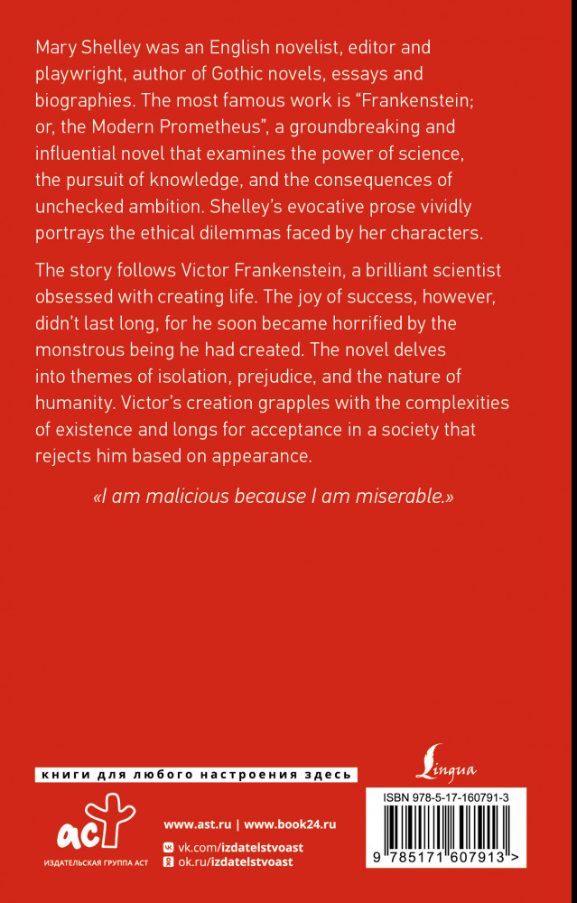 💳 Оплатить за товар можно при получении 🇰🇿 Есть бесплатная доставка по Казахстану от 1 дня 🎁 Копите бонусы с каждой покупки Серия: Exclusive Classics Paperback «Франкенштейн, или Современный Прометей» — готическое произведение английской писательницы Мэри Шелли, которое стало одним из самых популярных фантастических романов. Пугающая история об учёном по имени Виктор Франкенштейн, который решился постичь тайну зарождения жизни и смог создать человека. Но не просто человека, а живое чудовище, созданное из частей трупов. Учёный даже не предполагает, как дорого ему обойдётся его опасный и пугающий эксперимент. Насладитесь популярным готическим романом в оригинале — без адаптации и сокращений! |