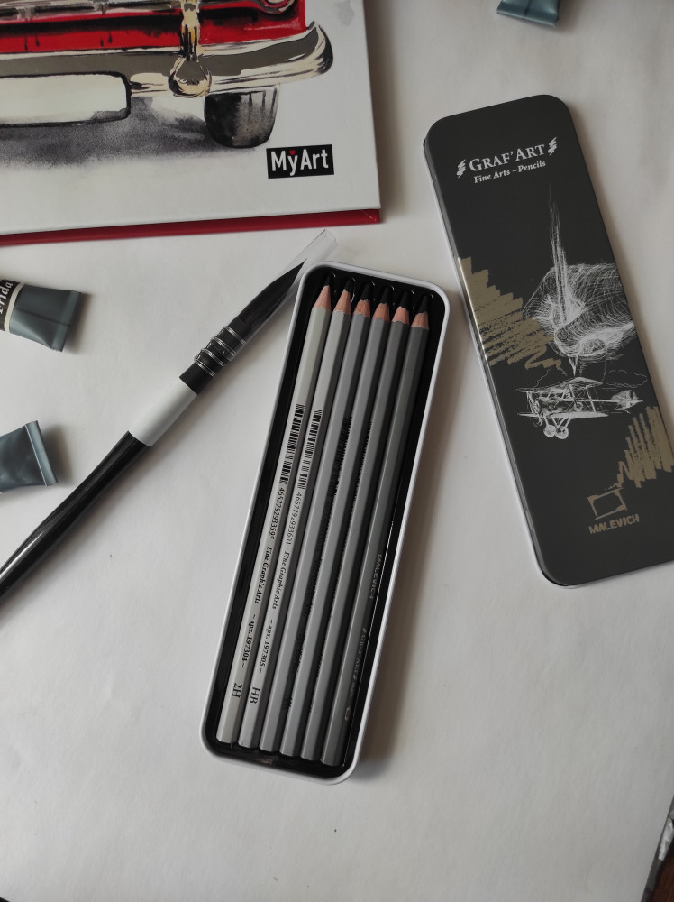 я для сравнения брала их и Фабер Кастелл питт графит матт,где аж до 14 В доходит. Так что хочу сказать, Малевич даже лучше. Серьезно, я сама удивилась. 8 В от Малевич одинаково с 14В Питт графит матт Фабер Кастелл. и даже жирнее смотрится. прилагаю фото, девушка нарисована Малевичем, бульдог нарисован Фабер Кастеллом. смотрите сами.
