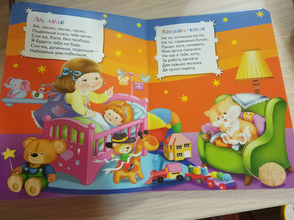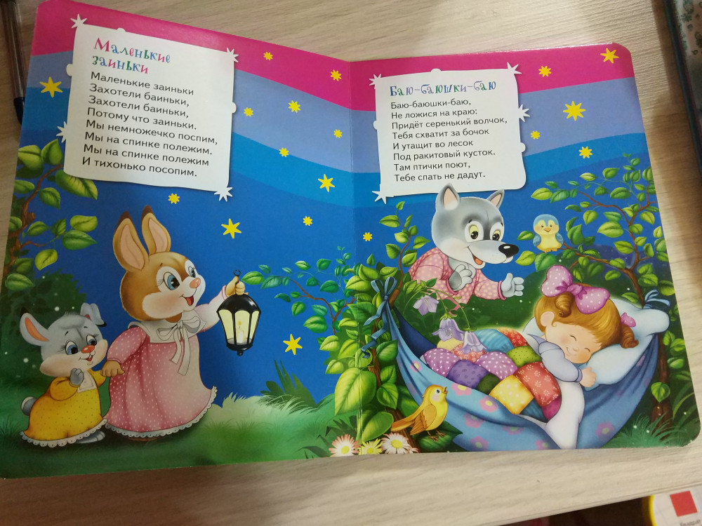 Отличная книжка! Иллюстрации яркие, зверюшки симпатичные, песенки разные - известные и несколько новых. Поем теперь перед сном. И так дочка очень любит эту книжку. Покупкой довольна. Спасибо, Флип!