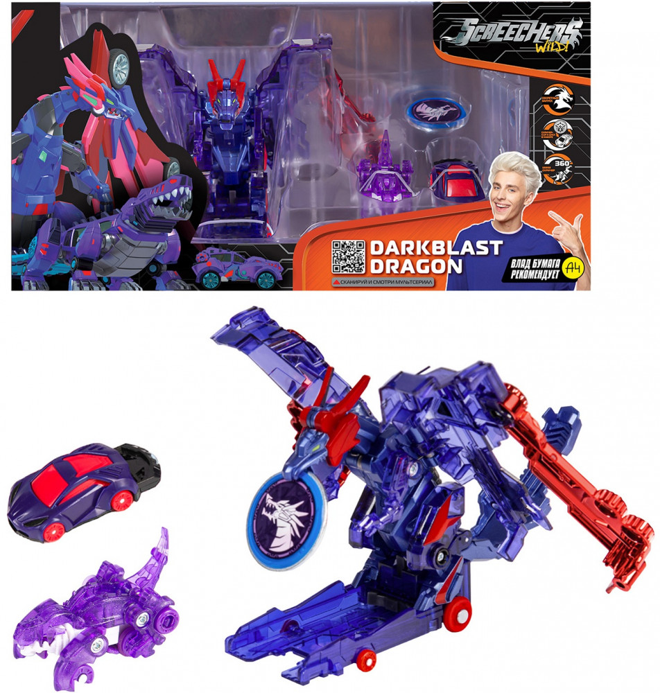 💳 Оплатить за товар можно при получении 🇰🇿 Есть бесплатная доставка по Казахстану от 1 дня 🎁 Копите бонусы с каждой покупки Серия: Дикие Скричеры Скричер тёмного повелителя Абаддона для ярких скричер-баттлов — Даркбласт Дрэгон! Мощный Дракон, способный удивить своего соперника! Основная фича — скрытая двойная трансформация, состоящая из 2 этапов! Даркбласт Дрэгон ловит диск или скричер-кар и выпускает его вперёд, затем раскрывается и активирует запуск второго скричера, спрятанного у себя внутри — уникального фиолетового минискричера, который трансформируется самостоятельно — проезжает и совершает кувырок на 360 градусов. |