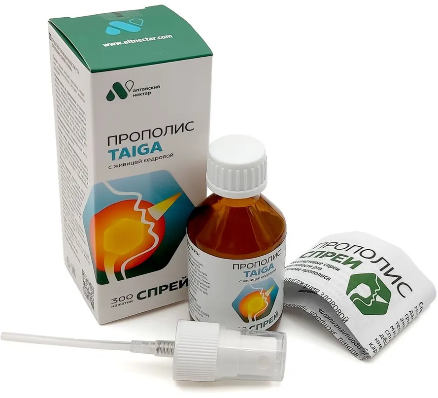 Прополисный спрей «Taiga» — многофункциональное средство, обладающее антибактериальным, противогрибковым, противовирусным, местным анестезирующим, противовоспалительным и заживляющим действием. Разрушительно воздействуя на болезнетворные микроорганизмы, сохраняет здоровую микрофлору полости рта и горла. Способствует поддержанию здоровья дёсен и зубов, предотвращая размножение патогенных бактерий, вызывающих кариес, освежает дыхание.
