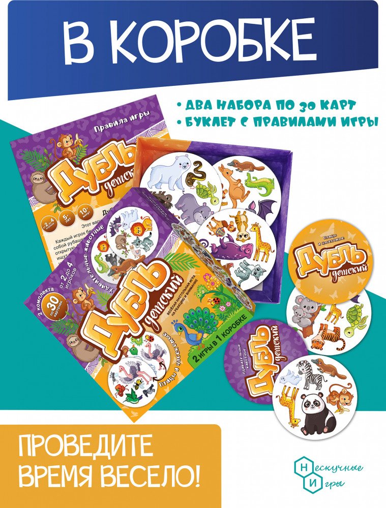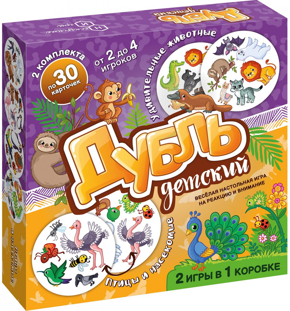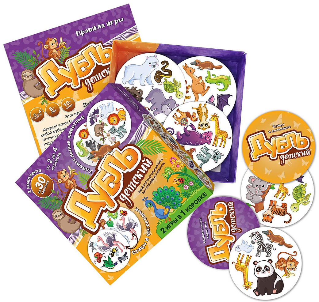 Нескучные игры Игра настольная «Дубль детский. Удивительные животные. Птицы»В данный момент этот товар отсутствует в продаже. Возможно, у нас найдется аналогичный или похожий товар здесь. Веселая игра на внимание и реакцию «Дубль» в новом варианте для младших детей. Цель игры: быстрее других находить одинаковые картинки на открытых карточках. По сравнению с классической игрой «Дубль 2» в этой игре картинки крупнее и на каждой карточке их на 1 меньше. Таким образом, ребенку будет проще найти совпадение. В одной коробке находится сразу 2 колоды карт: «Удивительные животные» и «Птицы». То есть, покупая игру «Дубль детский 2 в 1», вы получаете сразу 2 игры. |