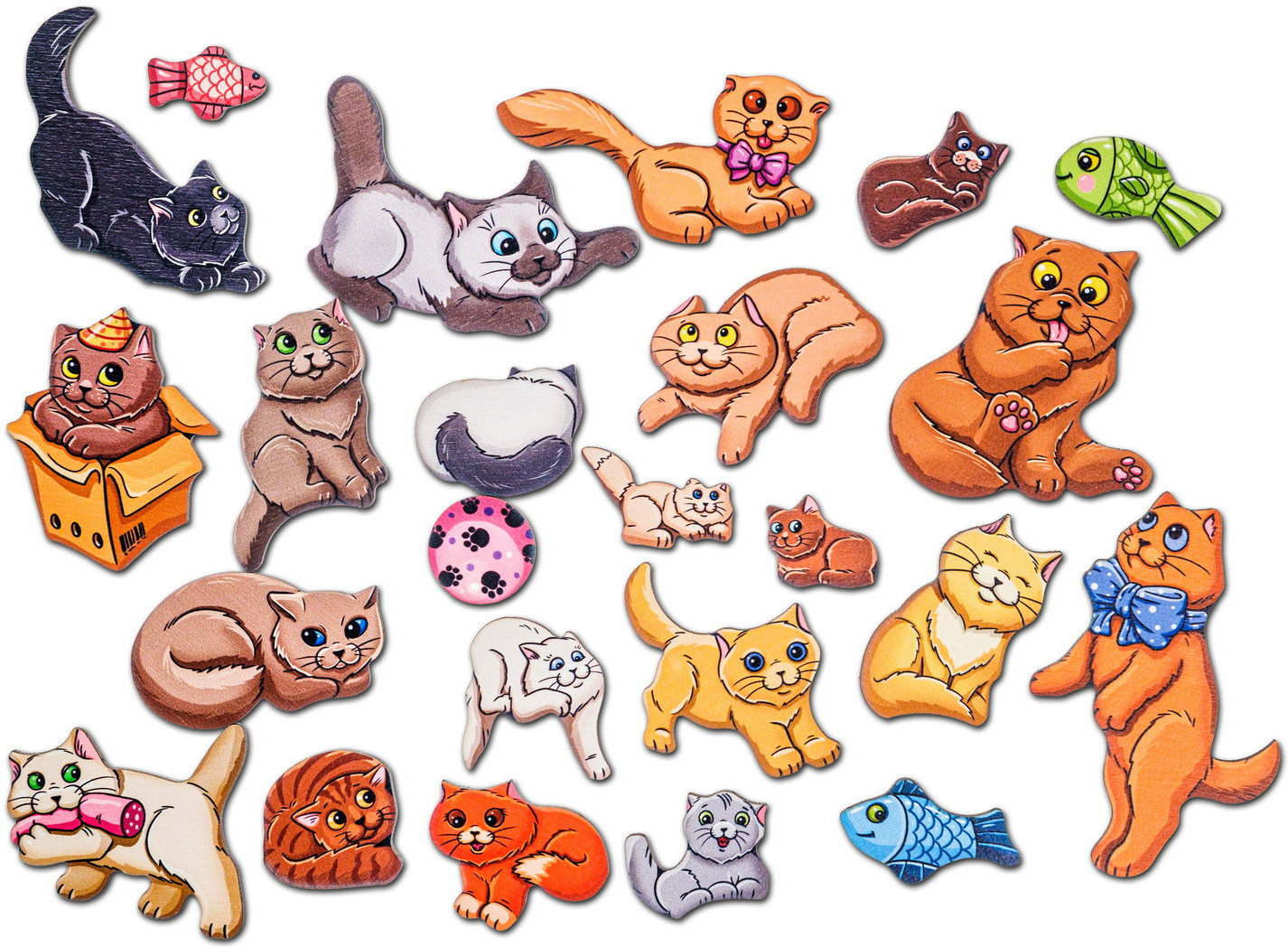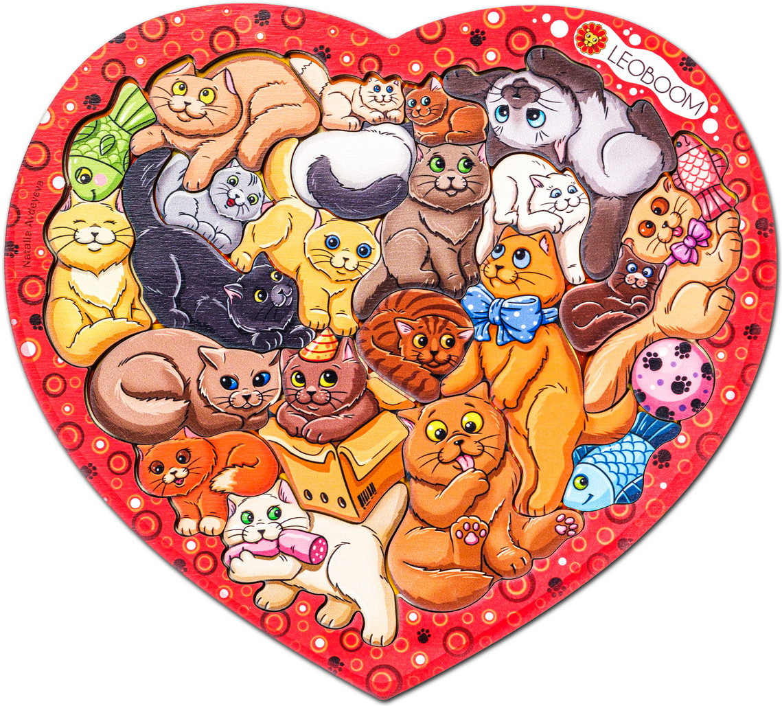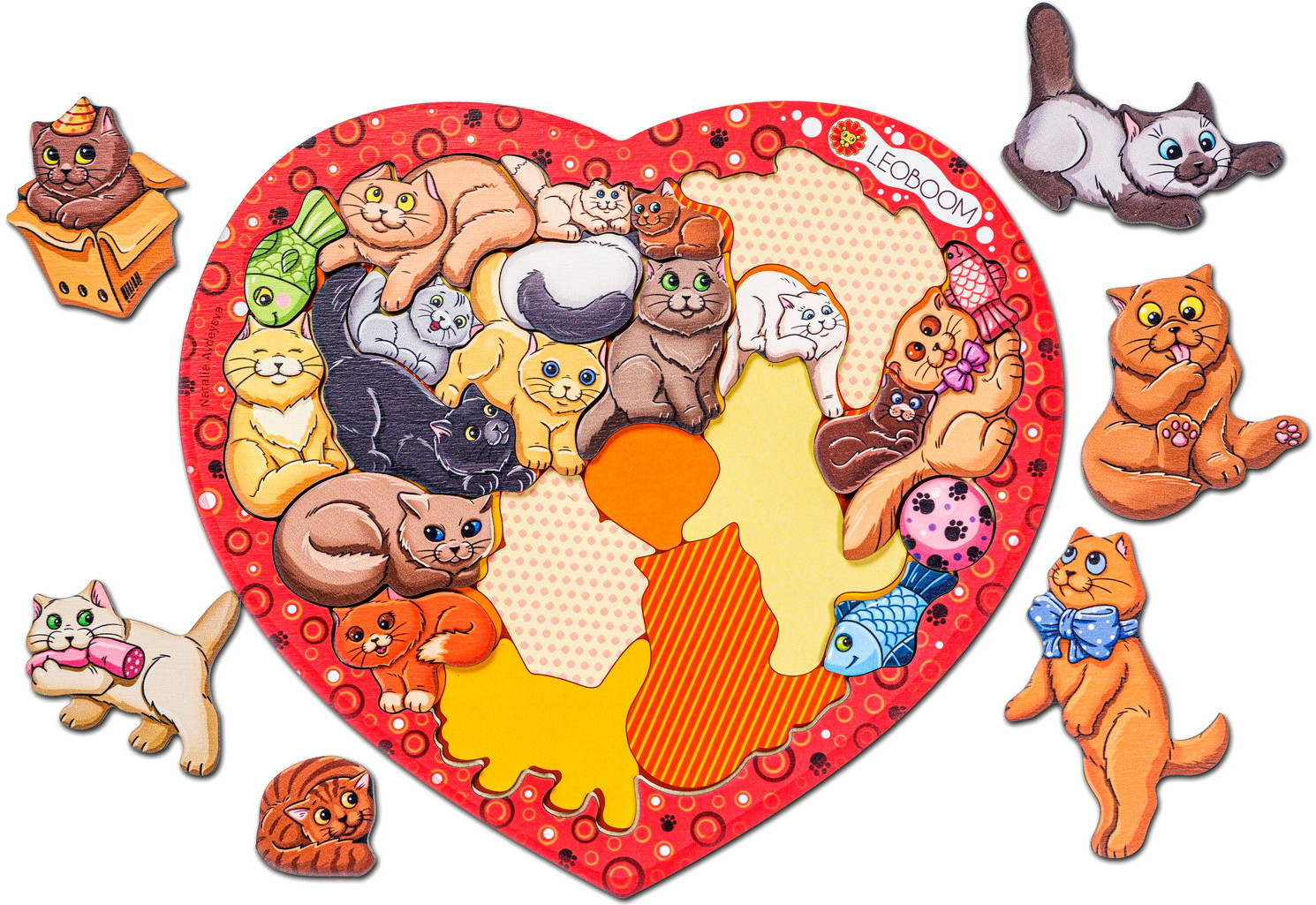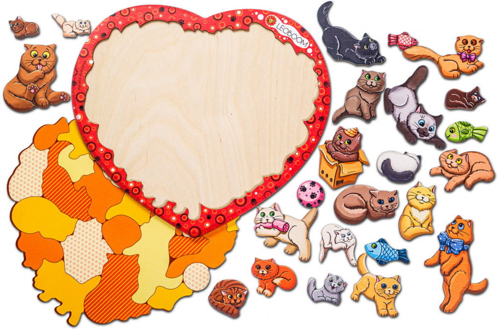 • игра «Собери котов». Достаньте 2-4 фигурки из пазла и попросите ребенка вставить котов обратно. Если ребенок легко справляется с этим заданием, попробуйте постепенно увеличить количество фигурок до максимального. Для этого достаньте все элементы пазла и предложите ребенку разместить котов в сердечке. Усложните игру — уберите подложку из основания пазла и предложите ребенку разместить котов в рамке без подсказки;