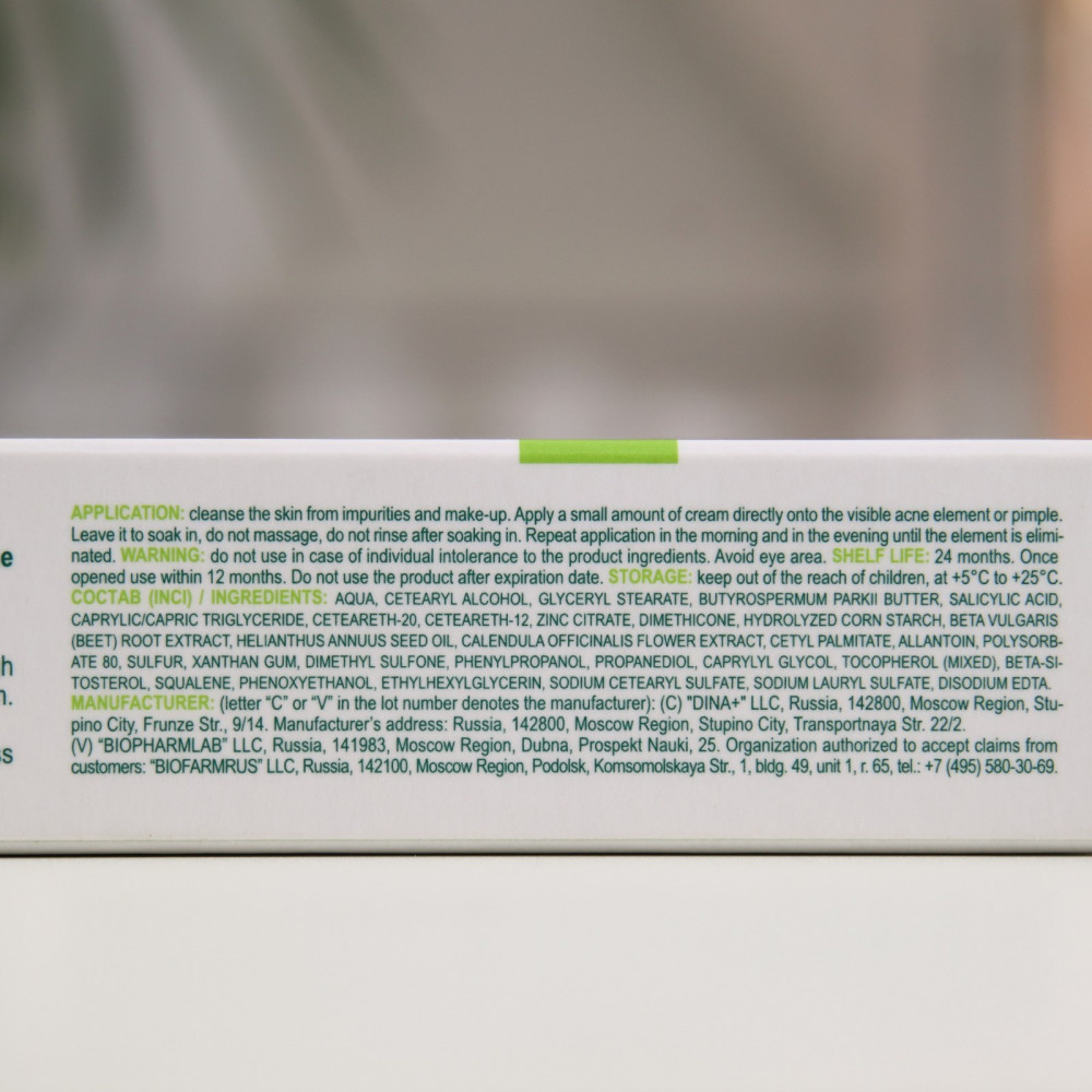 Способ применения: предварительно очистить кожу лица от загрязнений и макияжа. Небольшое количество крема нанести непосредственно на видимый элемент угревой сыпи, прыщик. Дать впитаться, не втирать, после впитывания не смывать. Повторять нанесение утром и вечером до полного исчезновения элемента. |