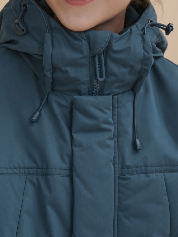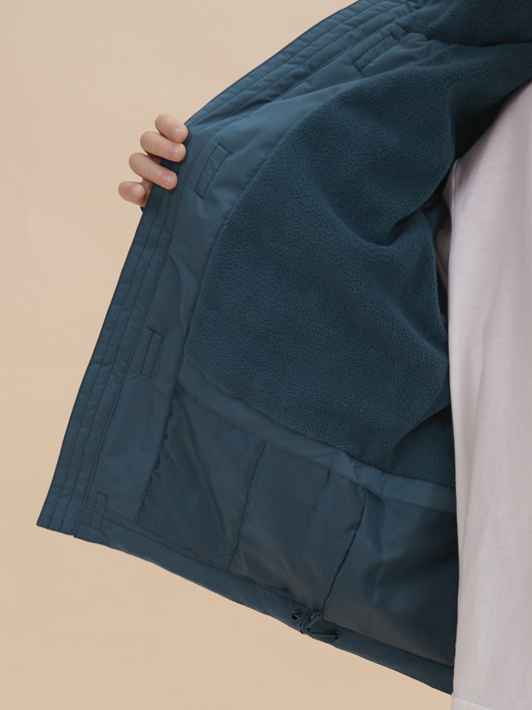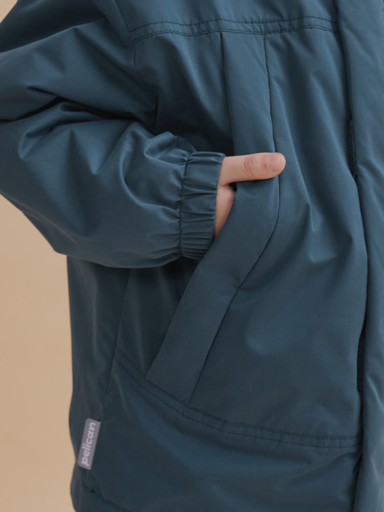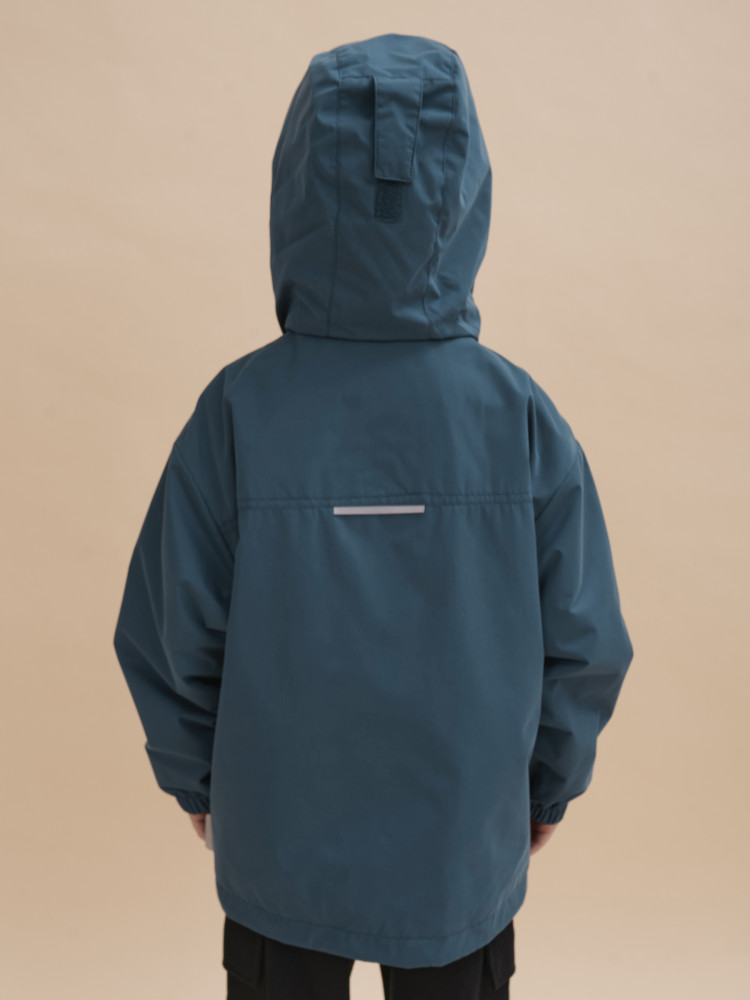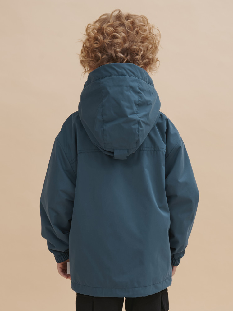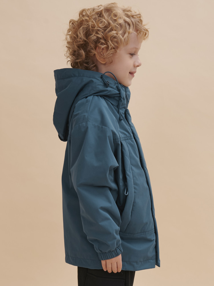 Ветровка для мальчика с длиной до середины бедра с практичным и ловким кроем, понятной формой и силуэтом. Застегивается на молнию и дополнительно на ветрозащитную планку с синтепоном для дополнительного тепла. Слегка спущенное плечо и углубленная пройма, мягкая линия плеча для удобства в носке.Можно вниз одеть объемное худи. Рукав объемный вверху, понизу собран на широкую резинку. Спереди — прорезные карманы на молнии. Вход в карман закрыт декоративными, наклонными, широкими планками. Капюшон с регулировкой на эластичном шнуре с фиксаторами. Сзади капюшон оформлен текстильной застежкой велькро с фиксирующим элементом — дополнительная регулировка объема и декоративный элемент. Внутренний воротник из флиса — тепло и комфортно. Объем низа изделия регулируется эластичным шнуром с пластиковыми фиксаторами.