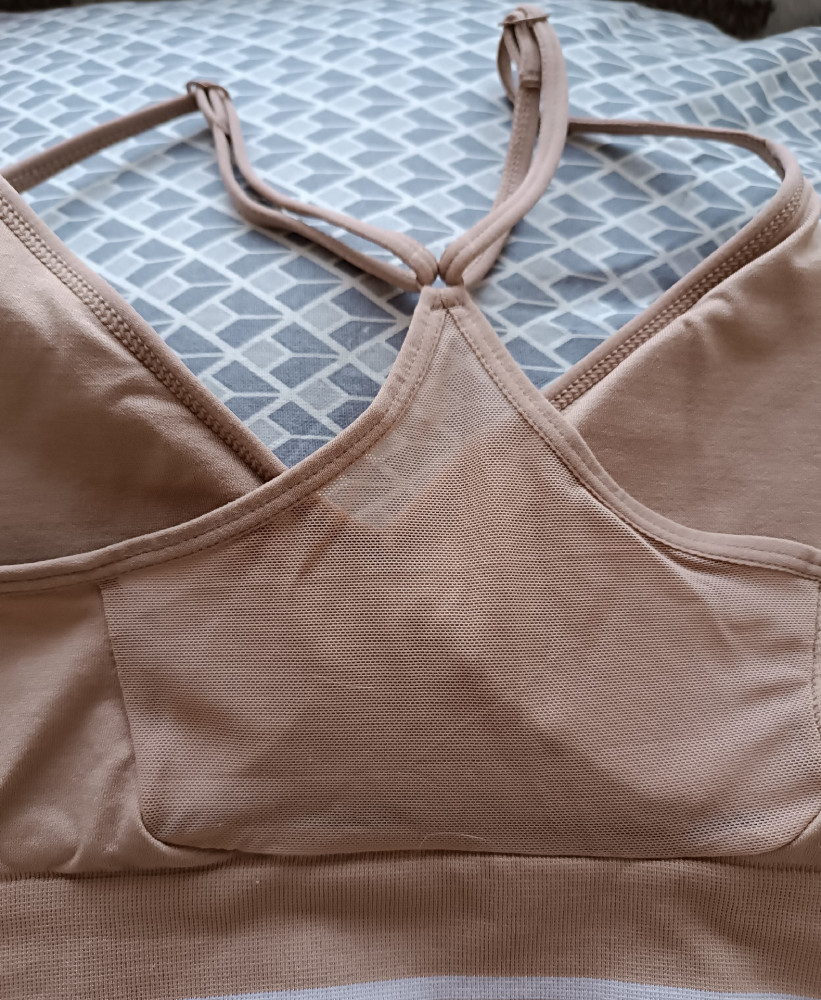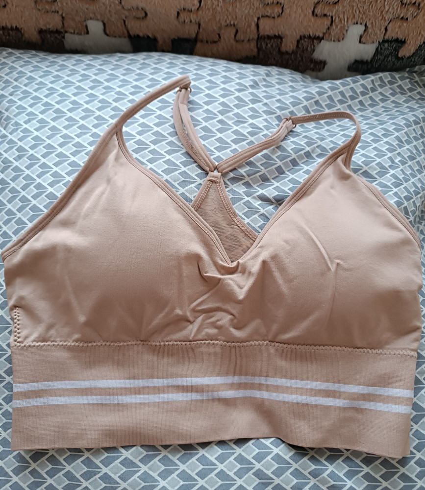 Удобная майка. Лямки регулируются, вставные чашки можно убрать. Грудь поддерживается хорошо, даже у такой бабульки, как я. Лично мне понравилось, что резинка под грудью широкая. На ОГ 98, ОТ 74 топ отлично подошёл, нигде ничего не давит, сидит комфортно.
