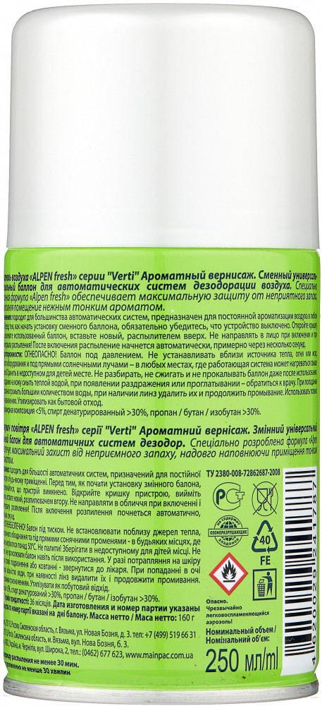 | Продукция торгового бренда Alpen создана по специальной формуле, за счет которой обеспечивается разрушение неприятного аромата, увлажнение воздуха, а взамен помещение заполняется приятным и свежим запахом. Использовать можно как в бытовых, так и в жилых помещениях. |
