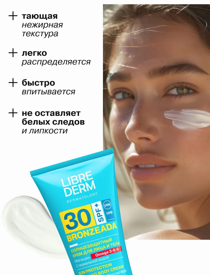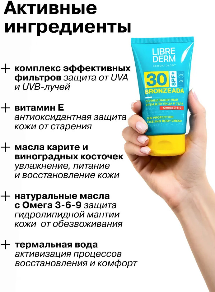Librederm Крем для лица и тела солнцезащитный с Омега 3-6-9 SPF 30+В данный момент этот товар отсутствует в продаже. Возможно, у нас найдется аналогичный или похожий товар здесь. Серия: Bronzeada Водостойкий крем SPF 30+ обеспечивает иммунную, антиоксидантную и фотостабильную защиту загорелой чувствительной кожи от негативного воздействия UVA/UVB лучей. Тающая нежирная текстура крема легко распределяется по коже, не оставляет белых следов и ощущения липкости. Синергия Омега 3-6-9 и термальной воды помогает коже сохранить увлажненность и комфорт. |