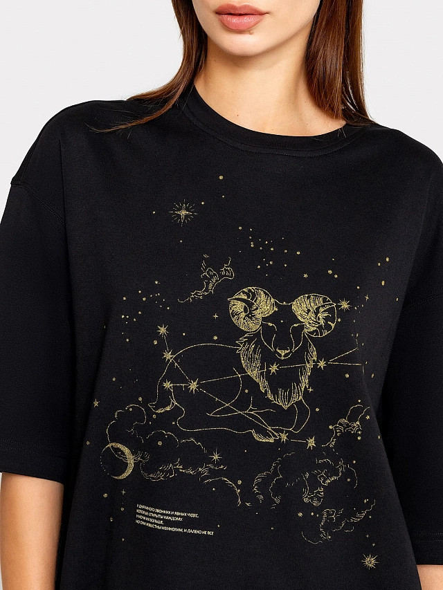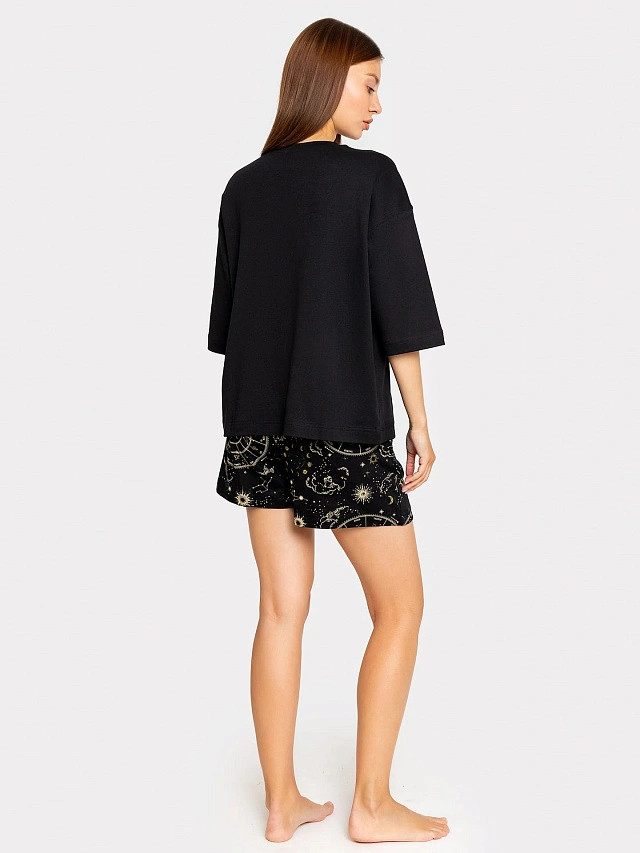 Стильный комплект женский из высококачественного хлопка в черном цвете с принтом в виде знака зодиака. Футболка свободного силуэта. Горловина круглой формы. Рукава втачные свободные, линия плеча спущена. Шорты свободного силуэта с высокой посадкой на талии. Пояс отрезной с эластичной тесьмой внутри. На передних деталях шорт карманы «хулиганы». Обладает мягкой и приятной на ощупь текстурой, идеально подходит для сна, отдыха и домашних дел. Эта женская пижама станет прекрасным дополнением к гардеробу каждой модной женщины, которая ценит комфорт и качество домашней одежды.
