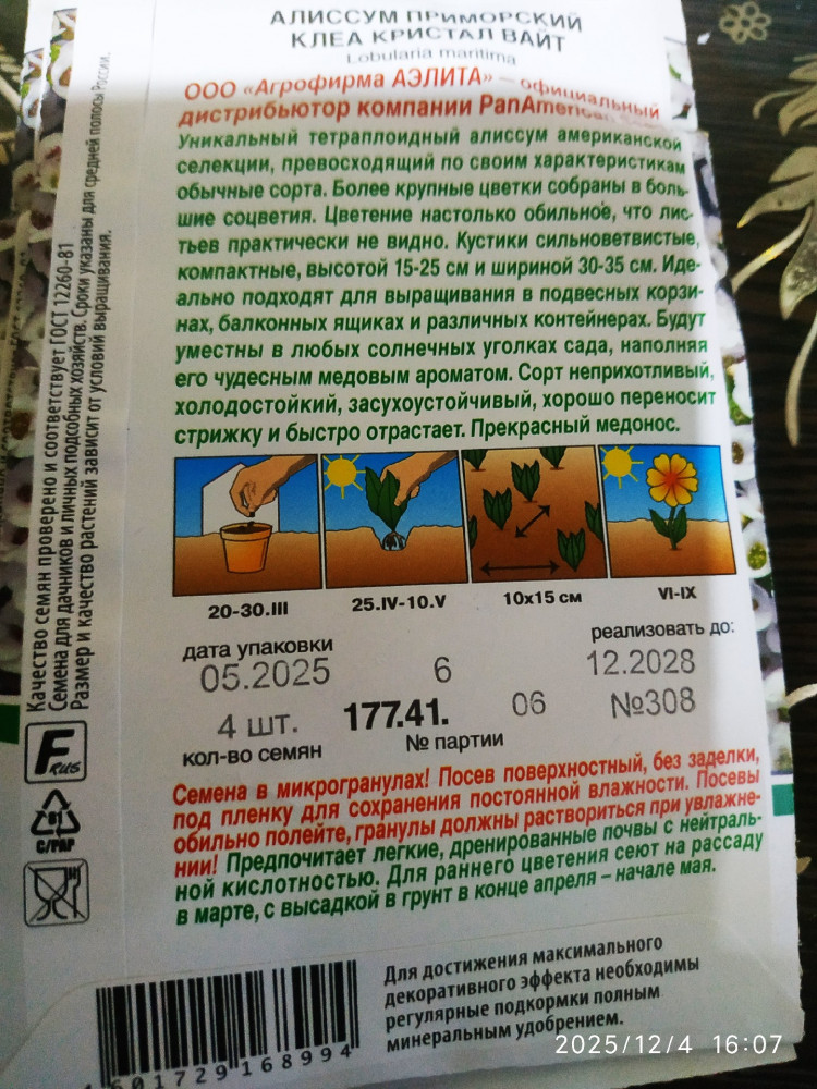 💳 Оплатить за товар можно при получении 🇰🇿 Есть бесплатная доставка по Казахстану от 1 дня 🎁 Копите бонусы с каждой покупки Уникальный тетраплоидный алиссум американской селекции, превосходящий по своим характеристикам обычные сорта. Более крупные цветки собраны в большие соцветия. Цветение настолько обильное, что листвы практически не видно. Кустики сильноветвистые, компактные, высотой 15-25 см и шириной 30-36 см. Идеально подходят для выращивания в подвесных корзинах, балконных ящиках и различных контейнерах. Будут уместны в любых солнечных уголках сада, наполняя его чудесным медовым ароматом. Сорт неприхотливый, холодостойкий, засухоустойчивый, хорошо переносит стрижку и быстро отрастает. Прекрасный медонос. |