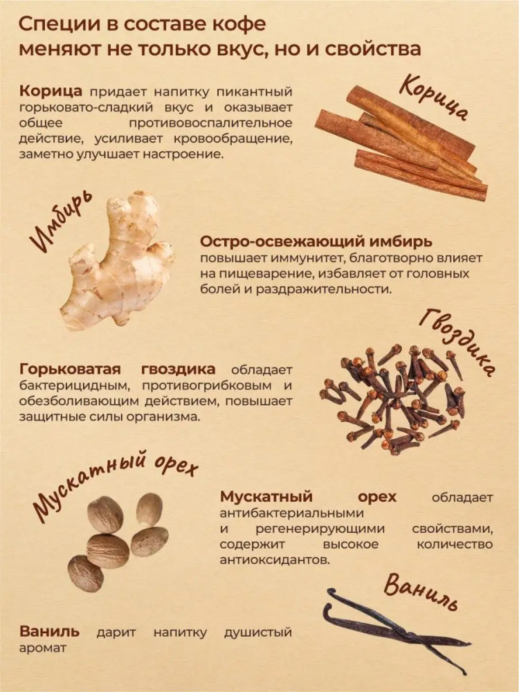 💳 Оплатить за товар можно при получении 🇰🇿 Есть бесплатная доставка по Казахстану от 1 дня 🎁 Копите бонусы с каждой покупки Смесь пряностей для кофе — только для настоящих гурманов. В набор специй входят полезные приправы, которые улучшат Ваше здоровье и наполнят зарядом бодрости. Корица молотая: обладает противовоспалительным эффектом, улучшает работу ЖКТ, у мужчин повышает потенцию. Имбирь помогает при похудении, снижает давлении, избавляет от метеоризма. |