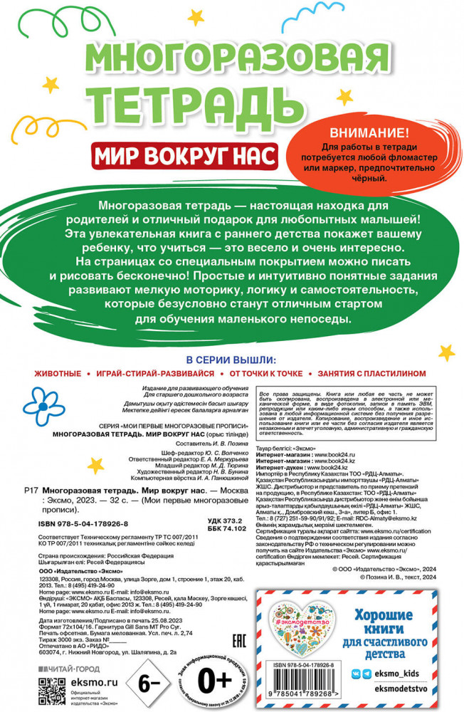 Серия: Мои первые многоразовые прописи Может ли книга стать любимой игрушкой маленького непоседы? Конечно, да! Если это многоразовая книжка-игрушка для любопытных малышей! Познавательное и увлекательное пособие позволит вашему ребенку не только весело, но и с пользой провести время. В издании ламинированные страницы, благодаря чему в книге можно рисовать фломастерами, стирать влажной салфеткой и писать снова! Бесконечное количество раз! Простые и интуитивно понятные задания помогут развить воображение, мышление и мелкую моторику малыша. Учитесь, играя! |