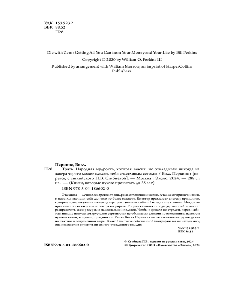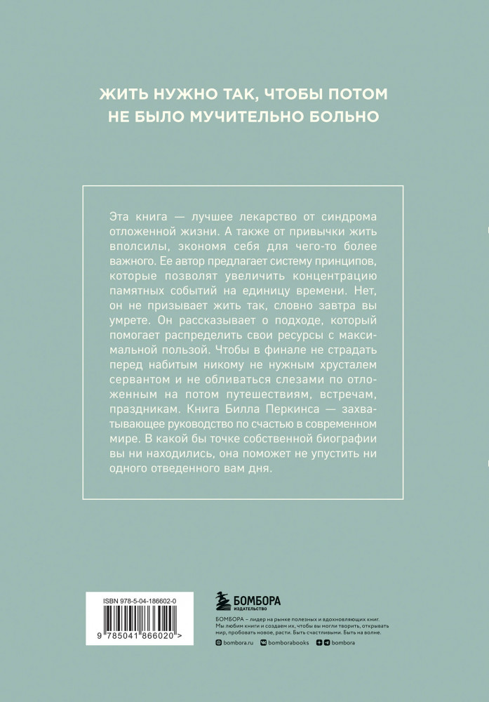 💳 Оплатить за товар можно при получении 🇰🇿 Есть бесплатная доставка по Казахстану от 1 дня 🎁 Копите бонусы с каждой покупки Серия: Книги, которые нужно прочитать до 35 лет Эта книга — лучшее лекарство от синдрома отложенной жизни. А также от привычки жить вполсилы, экономя себя для чего-то более важного. Ее автор предлагает систему принципов, которые позволят увеличить концентрацию памятных событий на единицу времени. Нет, он не призывает жить так, словно завтра вы умрете. Он рассказывает о подходе, который помогает распределить свои ресурсы с максимальной пользой. Чтобы в финале не страдать перед набитым никому не нужным хрусталем сервантом и не обливаться слезами по отложенным на потом путешествиям, встречам, праздникам. Книга Билла Перкинса — захватывающее руководство по счастью в современном мире. В какой бы точке собственной биографии вы ни находились, она поможет не упустить ни одного отведенного вам дня. |