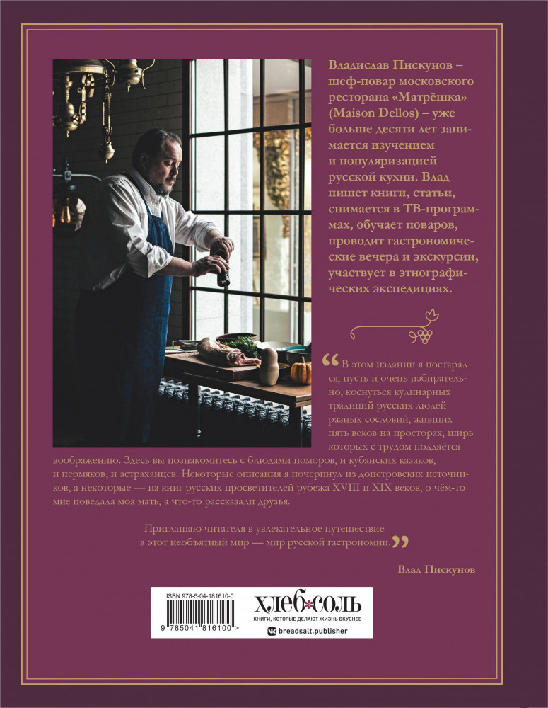💳 Оплатить за товар можно при получении 🇰🇿 Есть бесплатная доставка по Казахстану 🎁 Копите бонусы с каждой покупки Серия: Книги Влада Пискунова Знаменитый трехтомник о русской кухне теперь под одной обложкой! «Русская кухня. Главное за 500 лет» — переработанный вариант трехтомника шеф-повара ресторана «Матрешка», популяризатора русской кухни и автора множества кулинарных книг и статей — Владислава Пискунова. Автор выбрал для вас лучшее и оставил главное. Влад уже более 10 лет изучает русскую кухню: собирает рецепты из книг отечественных авторов, путешествует по России, общается с хранителями кулинарных традиций и ищет названия незнакомых русских блюд в «Толковом словаре живого великорусского языка» В. Даля. Автор «Русской кухни» сам приготовил, сфотографировал и съел блюда, которые вы теперь можете повторить самостоятельно! |