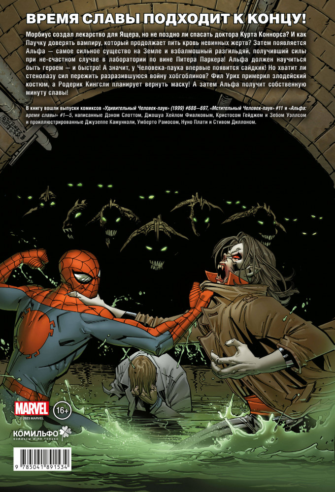 Человек-паук. Время славы. Том 4В данный момент этот товар отсутствует в продаже. Возможно, у нас найдется аналогичный или похожий товар здесь. Серия: Человек-Паук. Избранное Время славы подходит к концу! Морбиус создал лекарство для Ящера, но не поздно ли спасать доктора Курта Коннорса? И как Паучку доверять вампиру, который продолжает пить кровь невинных жертв? Затем появляется Альфа — самое сильное существо на Земле и взбалмошный разгильдяй, получивший силы при несчастном случае в лаборатории по вине Питера Паркера! Альфа должен научиться быть героем — и быстро! А значит у Человека-паука впервые появится сайдкик! Но хватит ли стенолазу сил пережить разразившуюся войну хобгоблинов? Фил Урих примерил злодейский костюм, а Родерик Кинглси планирует вернуть маску! А затем Альфа собственную минуту славы! |