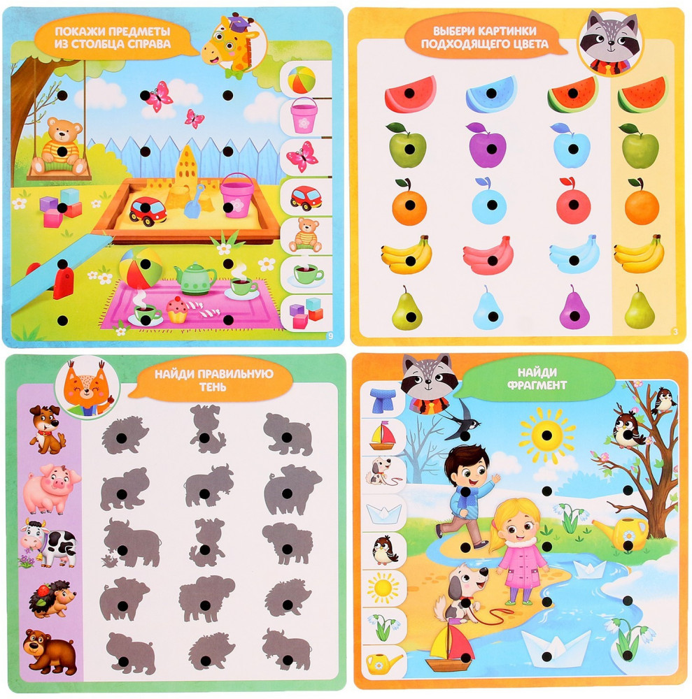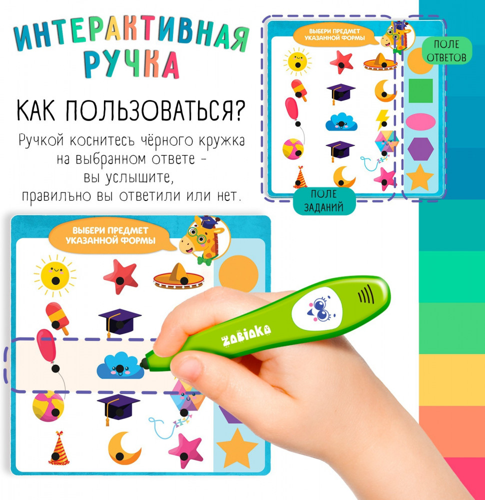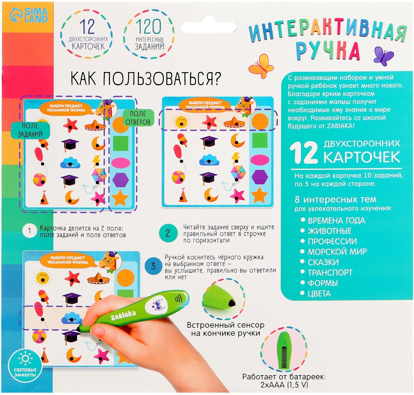 С игрушкой ребёнок откроет много нового и интересного про животный мир, профессии, формы, цвета и многое другое! Также малыш научится правильно держать ручку в руке. В набор входит 12 двухсторонних обучающих карточек. На них малыша ждёт 120 заданий. Каждая карточка посвящена одной определённой теме. Когда ребёнок коснется ручкой чёрного кружка на выбранном ответе — он услышит, правильно ответил или нет. 8 тем: времена года, животные, профессии, морской мир, сказки, транспорт, формы, цвета.